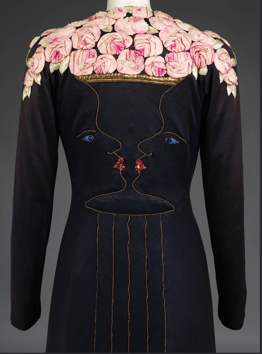 除了达利,1937年,Schiaparelli还与法国前卫诗人Jean Cocteau合作,设计了一件带有两张错视画面孔和玫瑰的晚礼服,这也成为了她标志性的风格。