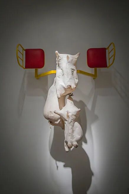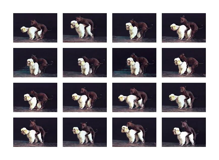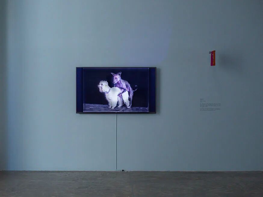 墨西哥无毛犬与法国贵宾犬交配。这部记录了母狗(为此受雇)和艺术家自己的公狗之间的性行为。