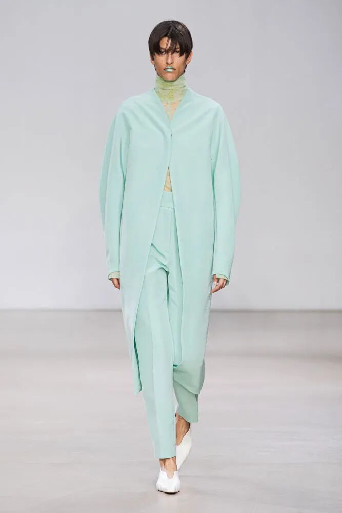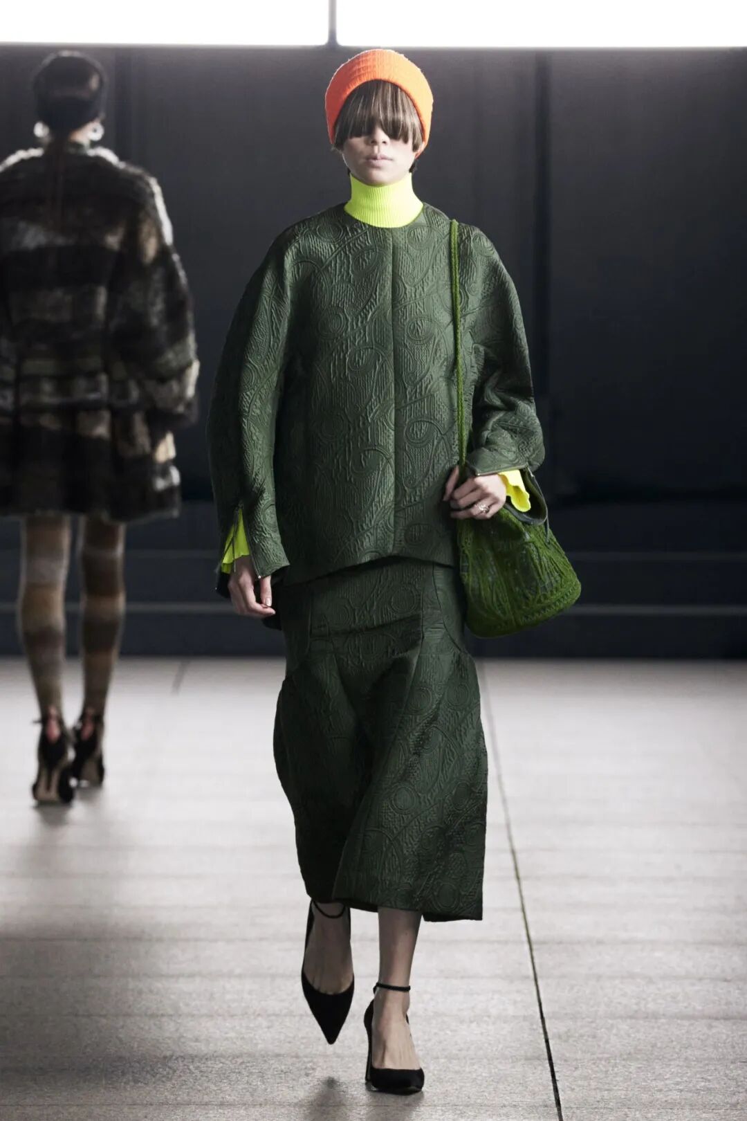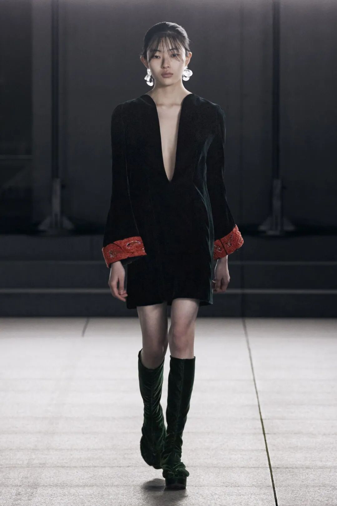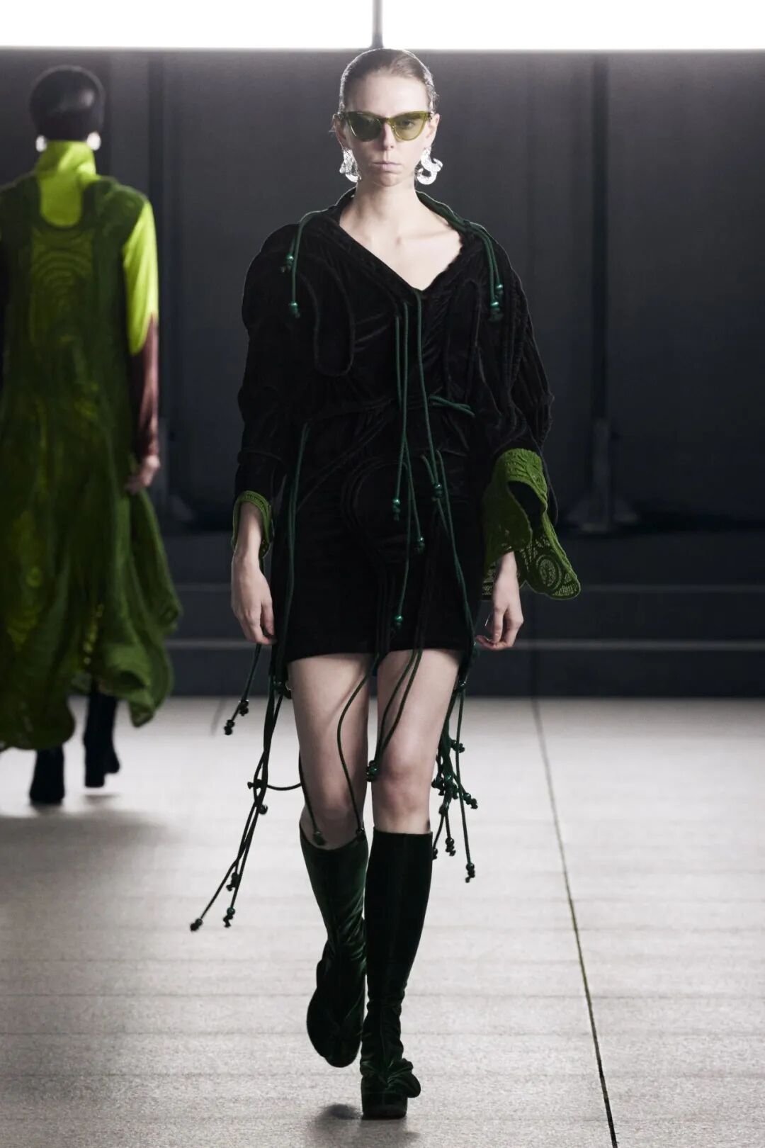 竹子主题在整个系列中得到了许多诗意化的诠释。例如,清新的薄荷绿色调激发了一些丝绸服装的灵感,在一些裙子上绣着由Kurogouchi自己设计的由竹叶交织而成的精致图案。