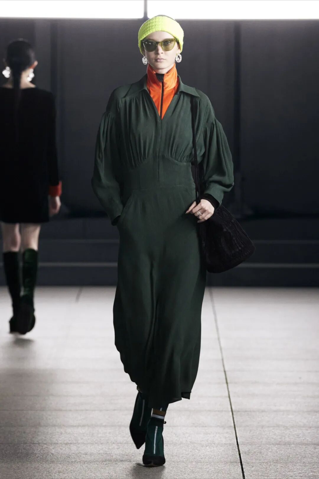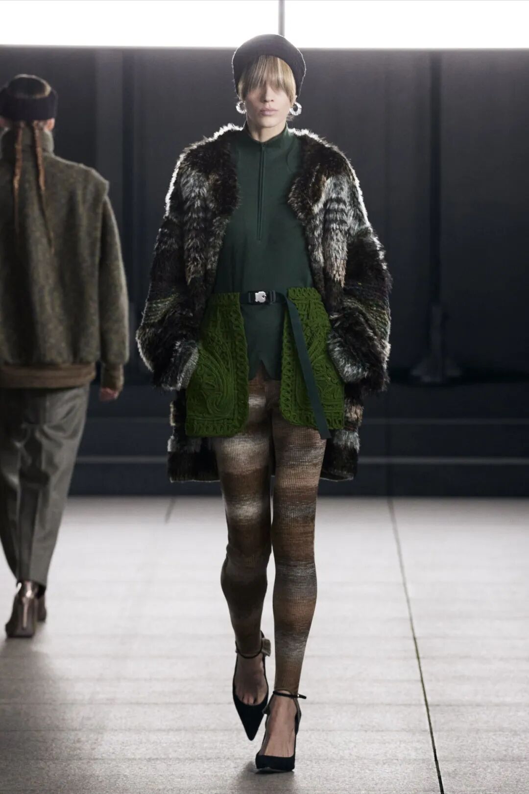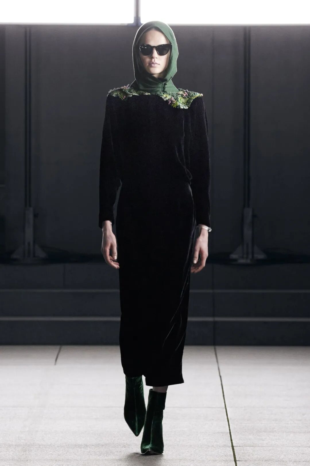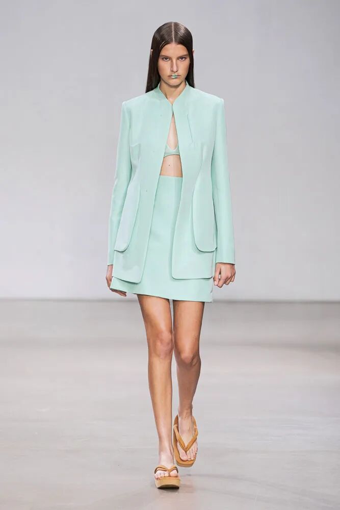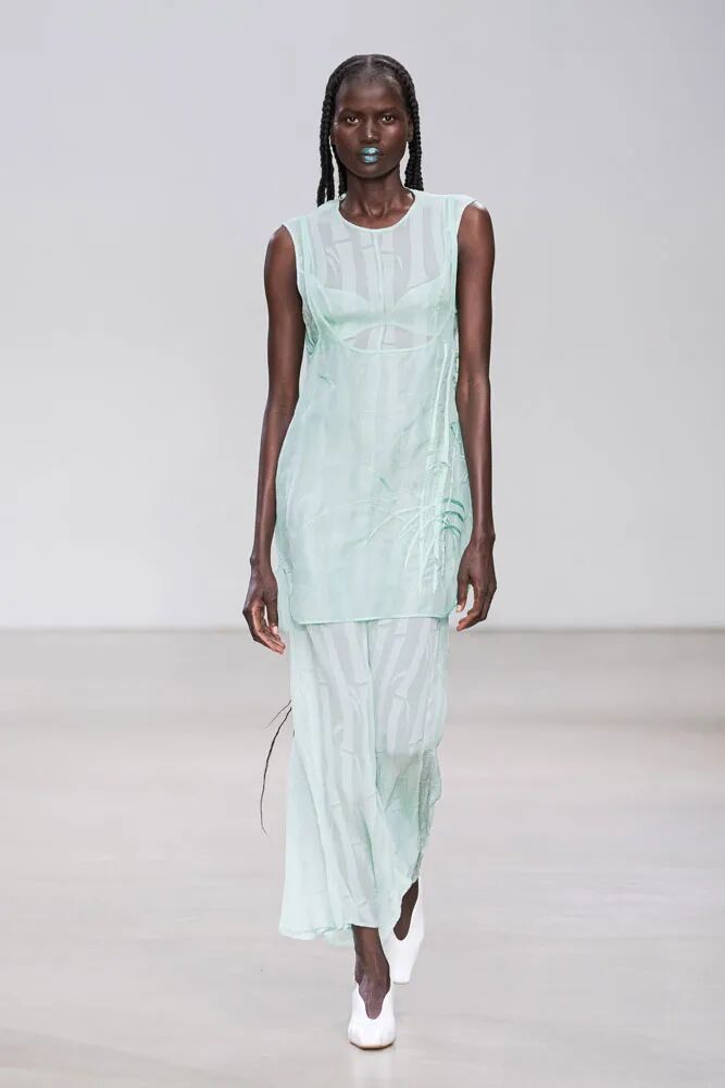 竹子主题在整个系列中得到了许多诗意化的诠释。例如,清新的薄荷绿色调激发了一些丝绸服装的灵感,在一些裙子上绣着由Kurogouchi自己设计的由竹叶交织而成的精致图案。