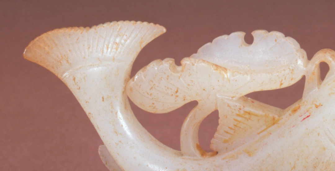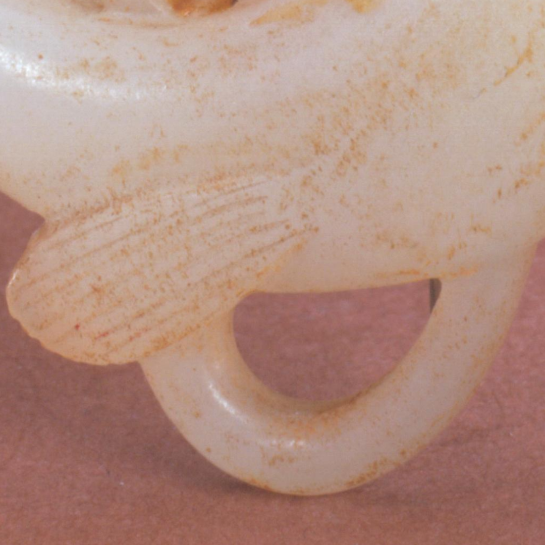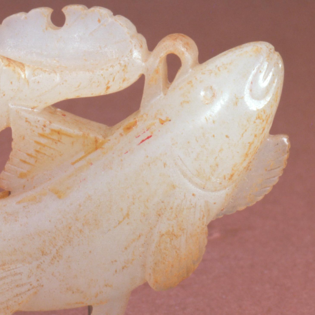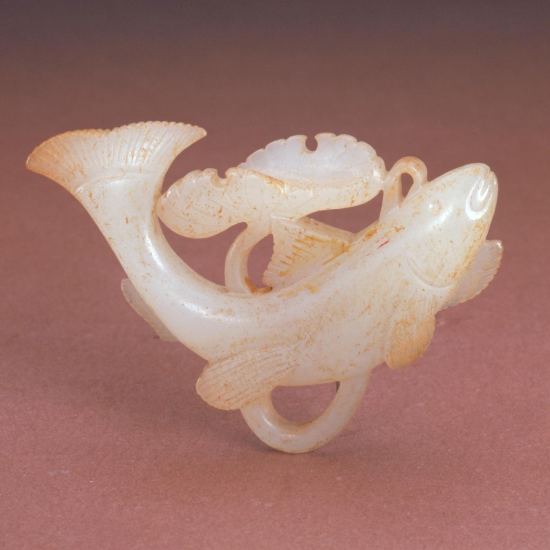 玉色白,表面有赭黄色斑。鱼小头,长身,无鳞,鱼身弯成弧状,昂首,尾上翘,鳍短而厚,共6片,其上有细阴线。鱼身旁伴一荷叶,长梗弯曲,盘而成环,可供穿系绳。