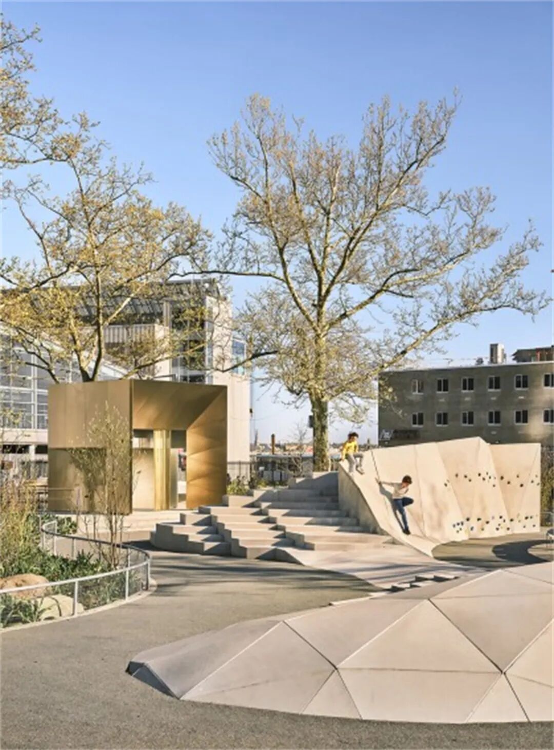不透水的铺装将地表径流引导至人行桥纵横交错的绿色雨水花园,将环境管理实践融入游乐体验的核心。