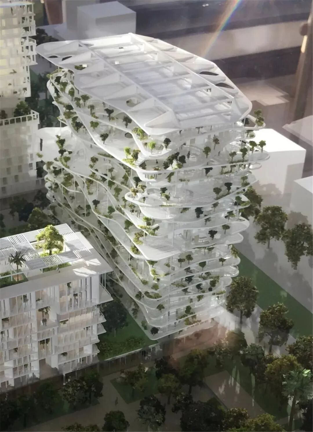 藤本壮介与法国年轻两家年轻事务所NL*A、OXO联手赢得法国蒙彼利埃一座17层高层塔楼,这座面积10000平方米的综合性塔楼功能包括集合公寓,餐厅,艺术画廊,全景酒吧以及办公室。白色建筑上从底部到顶部探出了众多“疯狂”的阳台,这些阳台就像是密密麻麻生长在树木的枝条,为此建筑算得上是一颗白色巨树。
