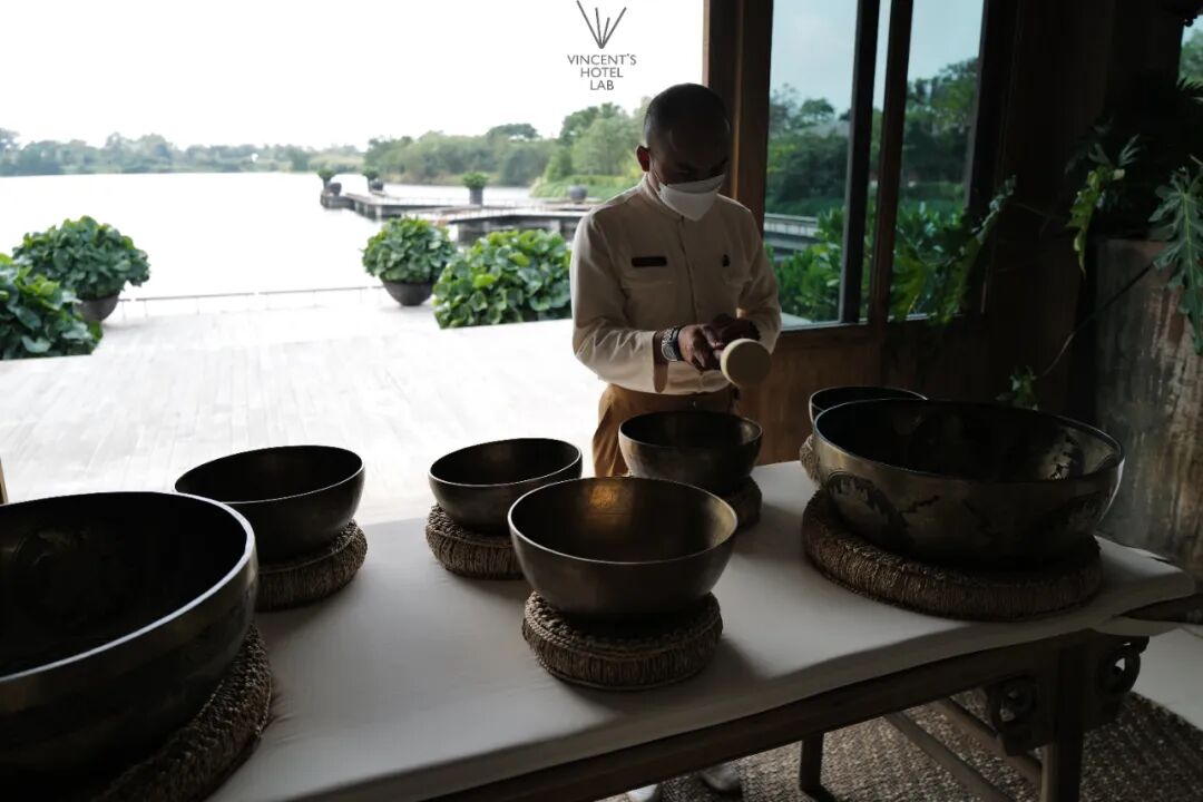 当你稍作休息后,音疗师即来到桌前奏响桌上的颂钵,用悦耳的音律配上湖上的清风,为你“洗尘”,并促使我“放下”压力、束缚与纷扰。