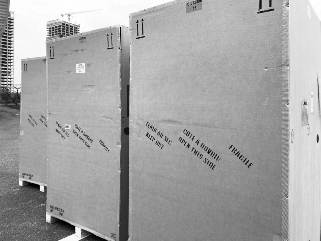 本月,Balenciaga高级定制来到上海徐汇滨江。看到朋友贴的到货照片,比人还高的一个个木箱上大大地用法语和英语印着“轻拿轻放”、“保持干燥”、“从这一面打开”。