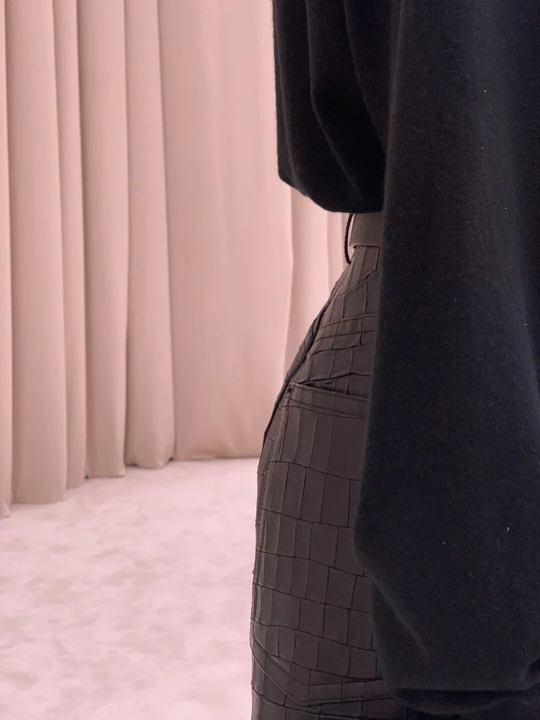 右边这条小牛皮鳄鱼纹拼贴男士阔腿裤,制造时长高达350小时