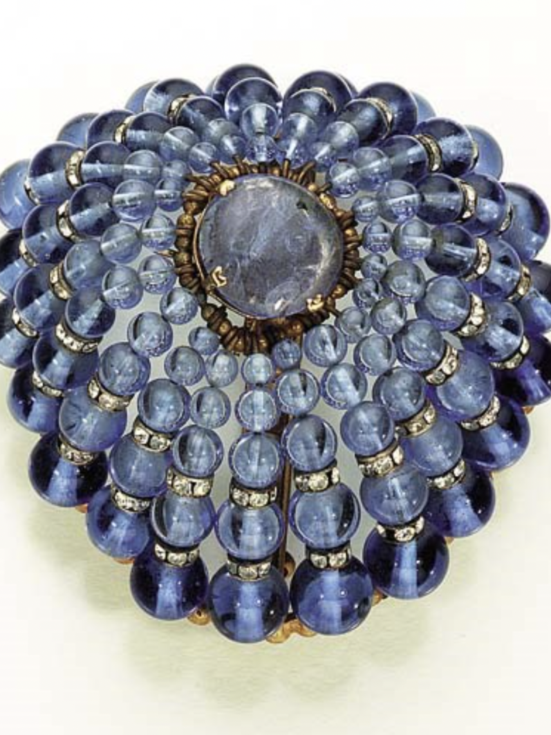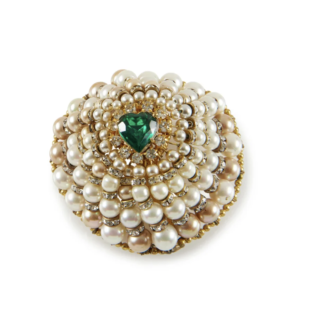 1960年的黄铜胸针,以人造珍珠点缀施华洛世奇水晶,拍卖行预估成交价2千500至3千500欧元