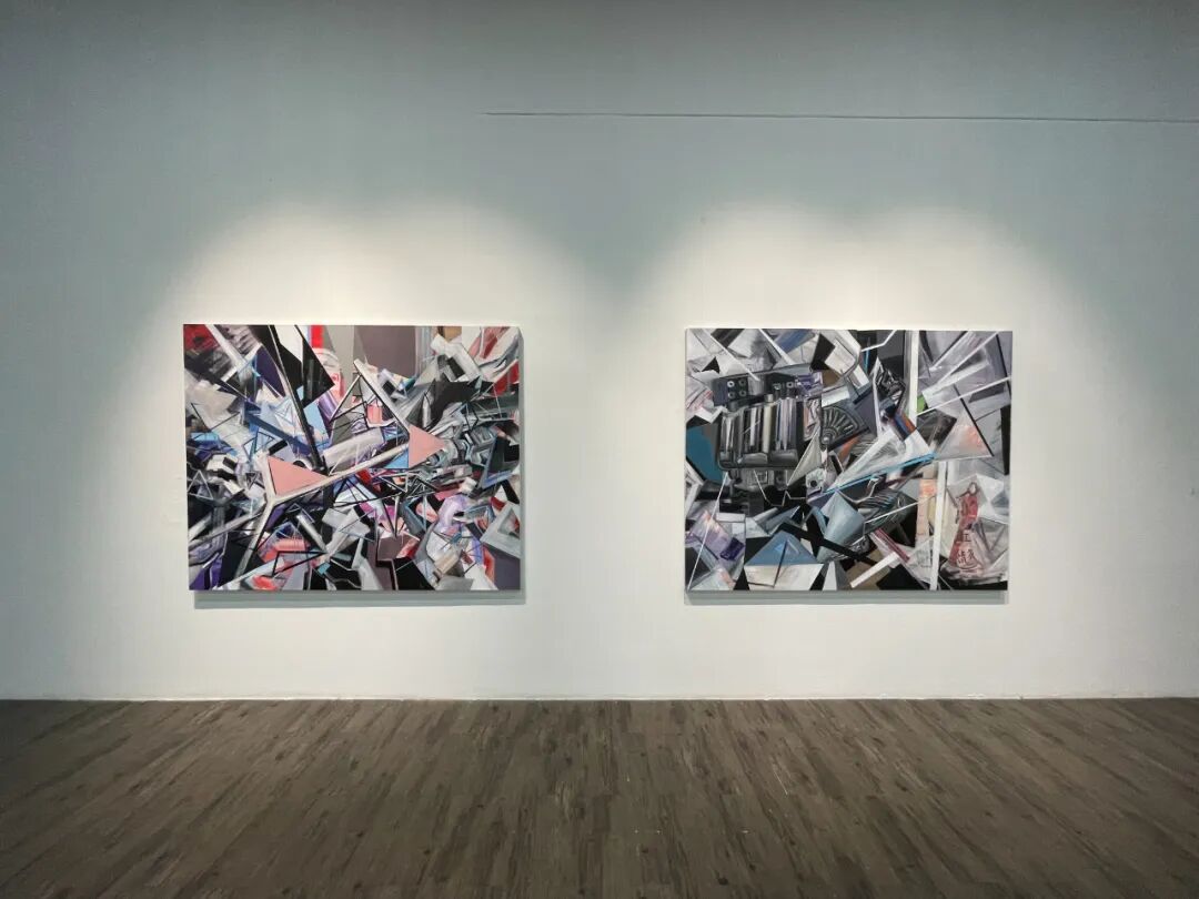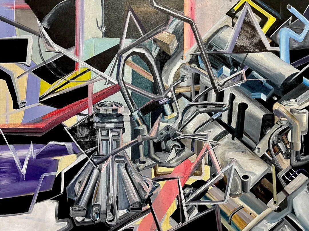 袁乐绘画中的放射线、集合体、变体的空间和机械要素,体现出力量、速度与激情。这些未来主义的经典元素直接来自于艺术家对汽车的热爱。他既喜欢汽车带来的速度和刺激的感觉,又专注于改装和驾驶汽车中的精密细节和理性操作。因此袁乐的绘画中不仅能看到强烈的个人表达,还可以看到他绘画中的金属机械的精美质感。在早期作品中,袁乐运用娴熟的绘画技法和细腻的写实语言表达自己的喜好。在艺术语言不断提纯的过程中,他的绘画开始由具象转向抽象,由事物转向感觉,由经验转向体验。在他的作品中,未来派所崇拜的机器这一具体形象符号被解码,以速度、力量、感觉、质感等艺术语言重新编码,构成了在感性和理性、释放和控制、观感和触感之间的张力。
