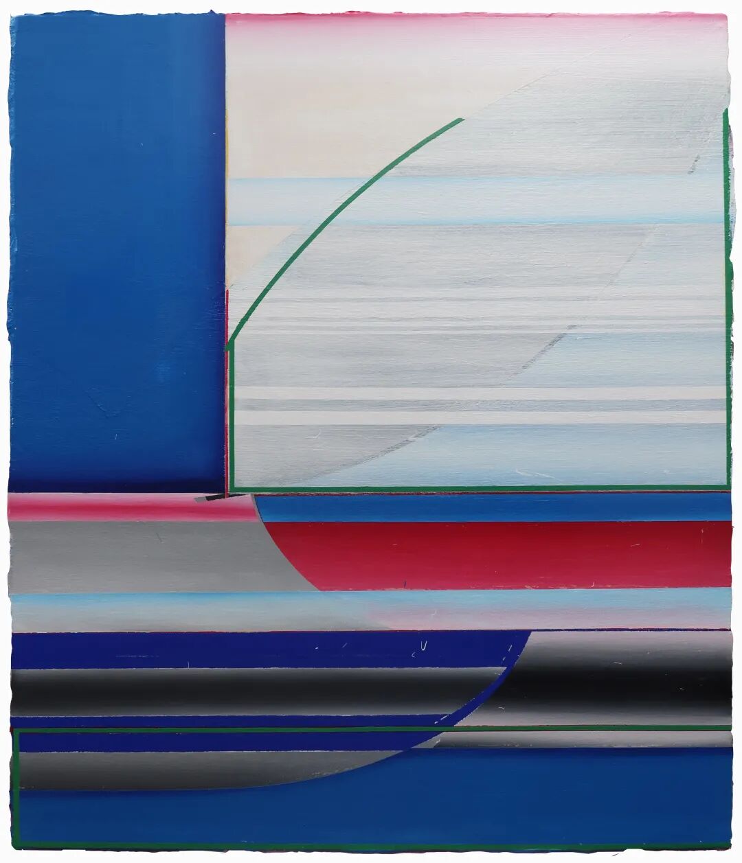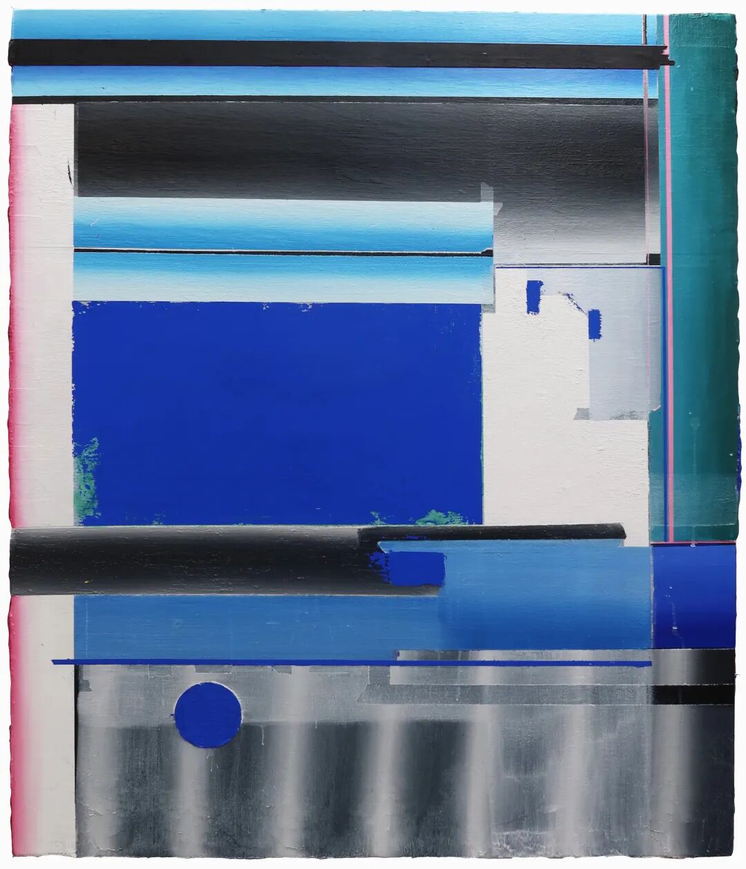 再编码的能量也来自于平行现实世界所提供的新经验和新感受。在丁天翔、洪张博、李思奇的作品中,我们看到年轻画家们将新的视觉经验编入了作品。在丁天翔的绘画中,我们可以看到类似色域派、硬边绘画或者里希特的语言,但丁天翔的画面体现出一种与前辈大师所不同的当代特征,渐变色块的处理和不规则的锋利边缘线,让人联想到手机屏幕破碎时形成的不规则纹理,以及由此产生的电子花纹。此刻我们所处的触屏时代可能并不直接作用于抽象绘画语言,但是这种全新的视觉体验无疑是此前绘画中所没有的。我将之理解为触屏时代视觉经验在绘画语言上的平行投射,这也给抽象艺术编入了当代的生活内容。