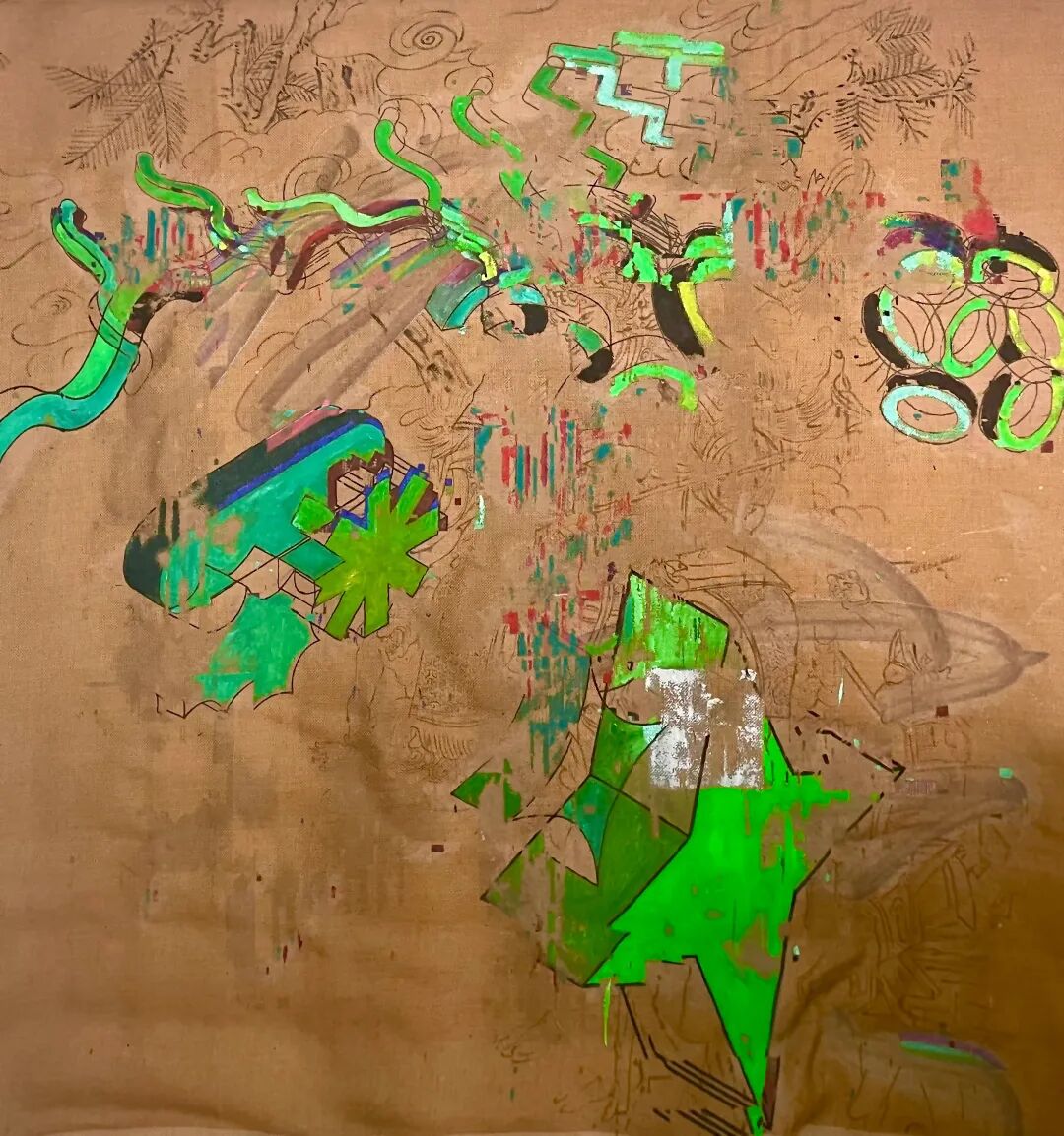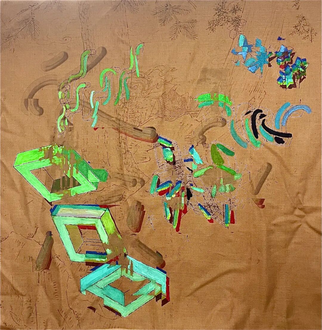 李思奇的绘画语言在五个人中是相对直接的。他的绘画是抽象与具象的拼贴,也是传统文化与当代文化的混编与碰撞。在这一系列作品中,艺术家在画面背景中绘制了中国传统绘画的经典图案,在其上艺术家又用鲜艳的色彩加入属于赛博世界的集合图形,使画面层次之间充满对抗。两种冲突要素在对抗中又相互消解,仿佛数字世界中的像素坏点,又如岁月在墙面留下的斑驳痕迹。