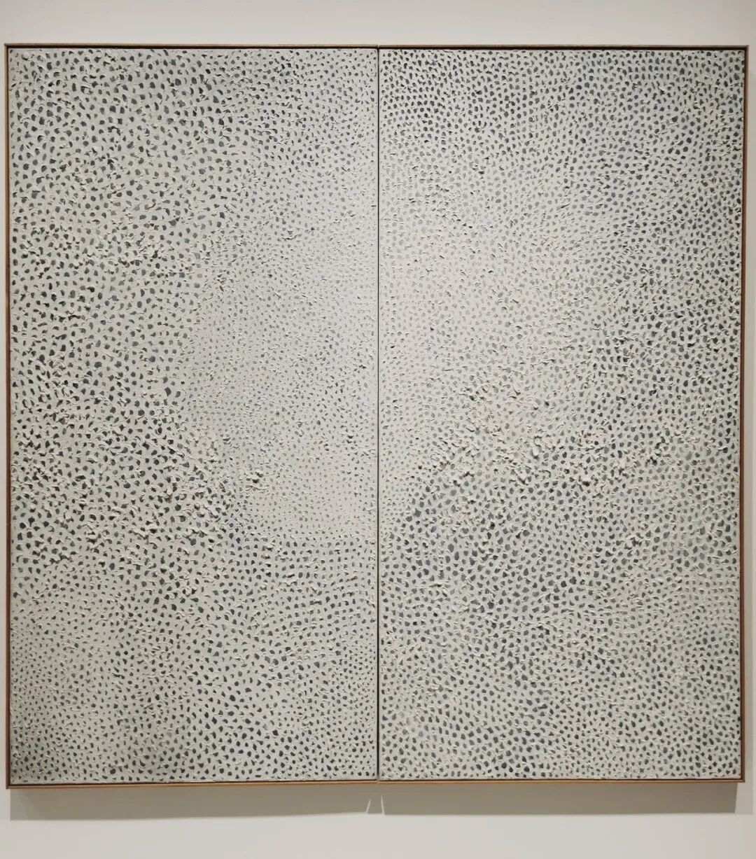 通过绘画重复的图案,她企图控制住自己的幻觉和脑中不受控的声音。通过无数的波点,她能感受到自我的消融,感受到一切融入一个新的世界,再也没有恐惧。