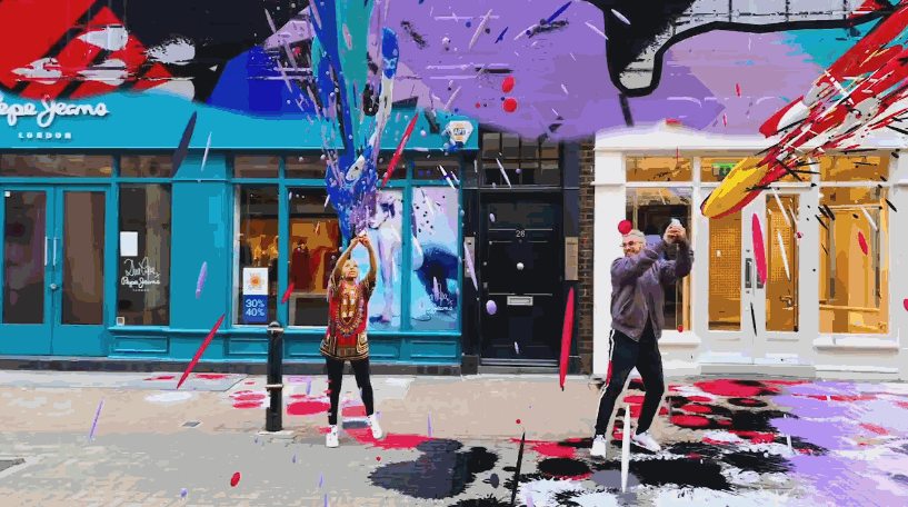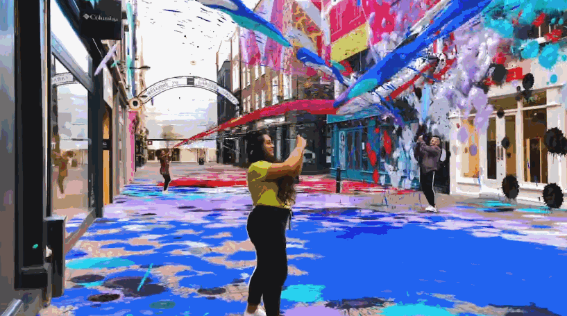 它的玩法足够简单,只需要将Snapchat镜头对准伦敦景点卡尔纳比街,就能在街道上方喷洒红色和蓝色的“喷泉”,以AR的形式将虚拟色彩涂鸦在街道上,装饰周边的街道和商店。