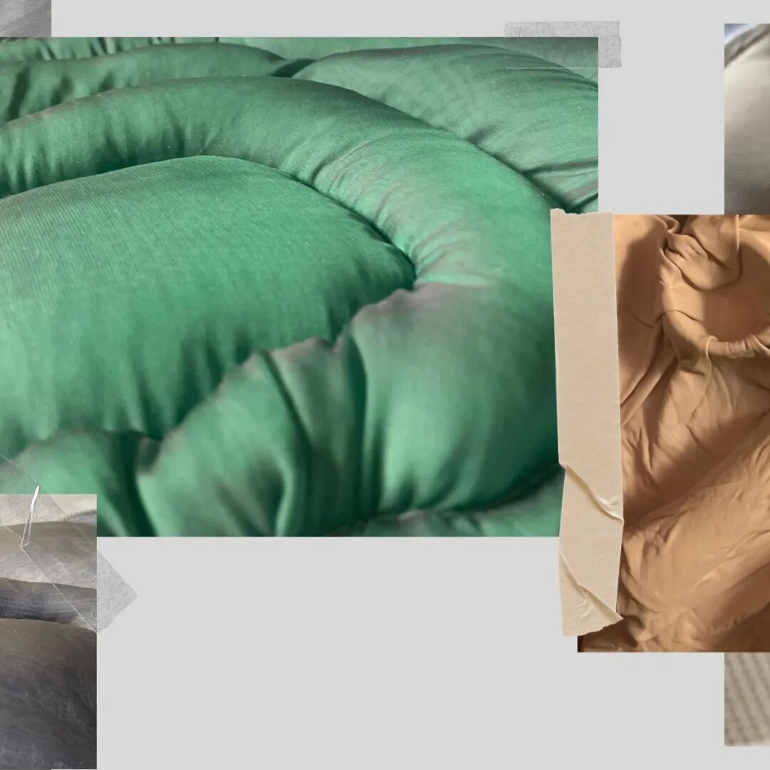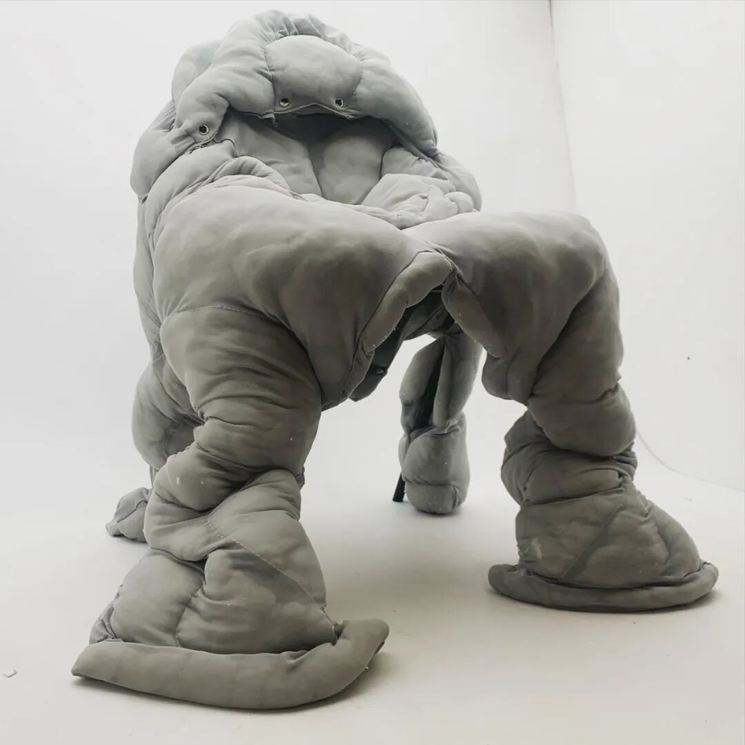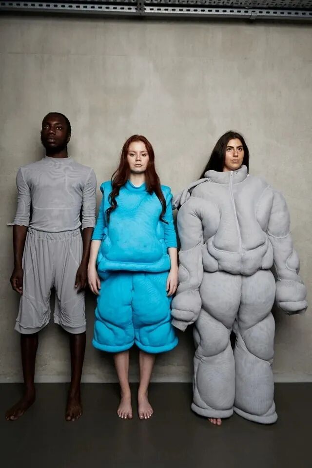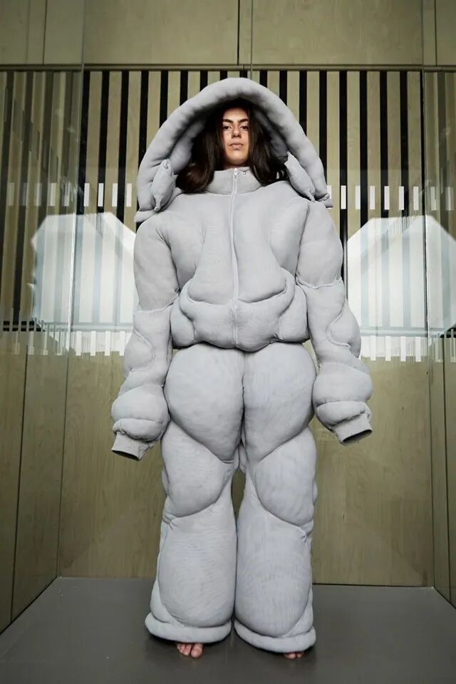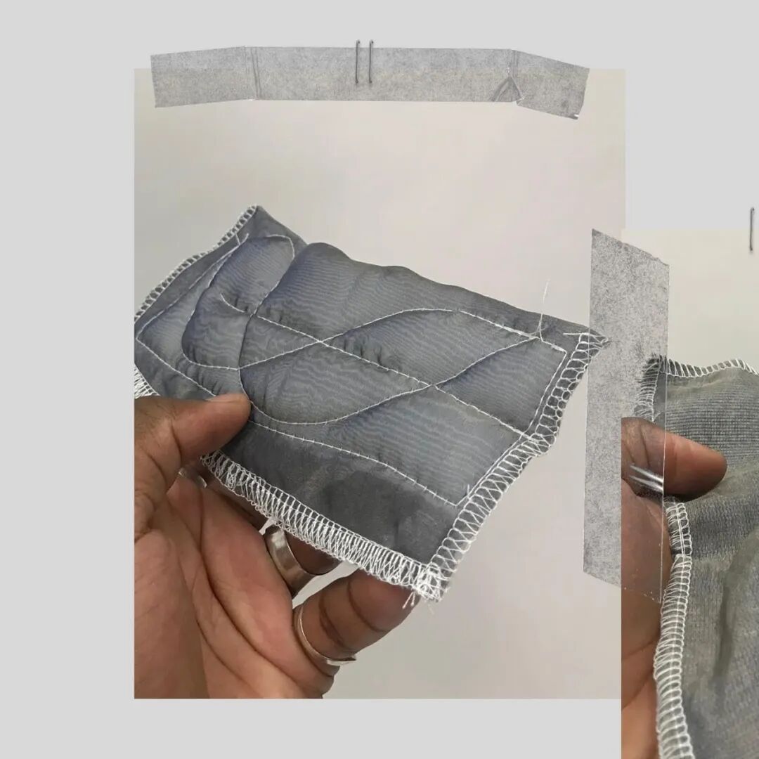 在其中的趣味体验的驱使下,他开始以人形为灵感,用橡皮泥制作手掌大小的人体模型,并用中国欧根纱和塑料网纱制作面料小样还原模型形状,最终在柔软触感的填充物与双向拉伸网的结合中获得了最理想的效果。