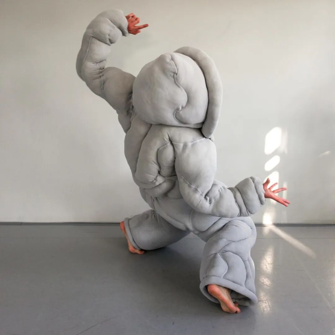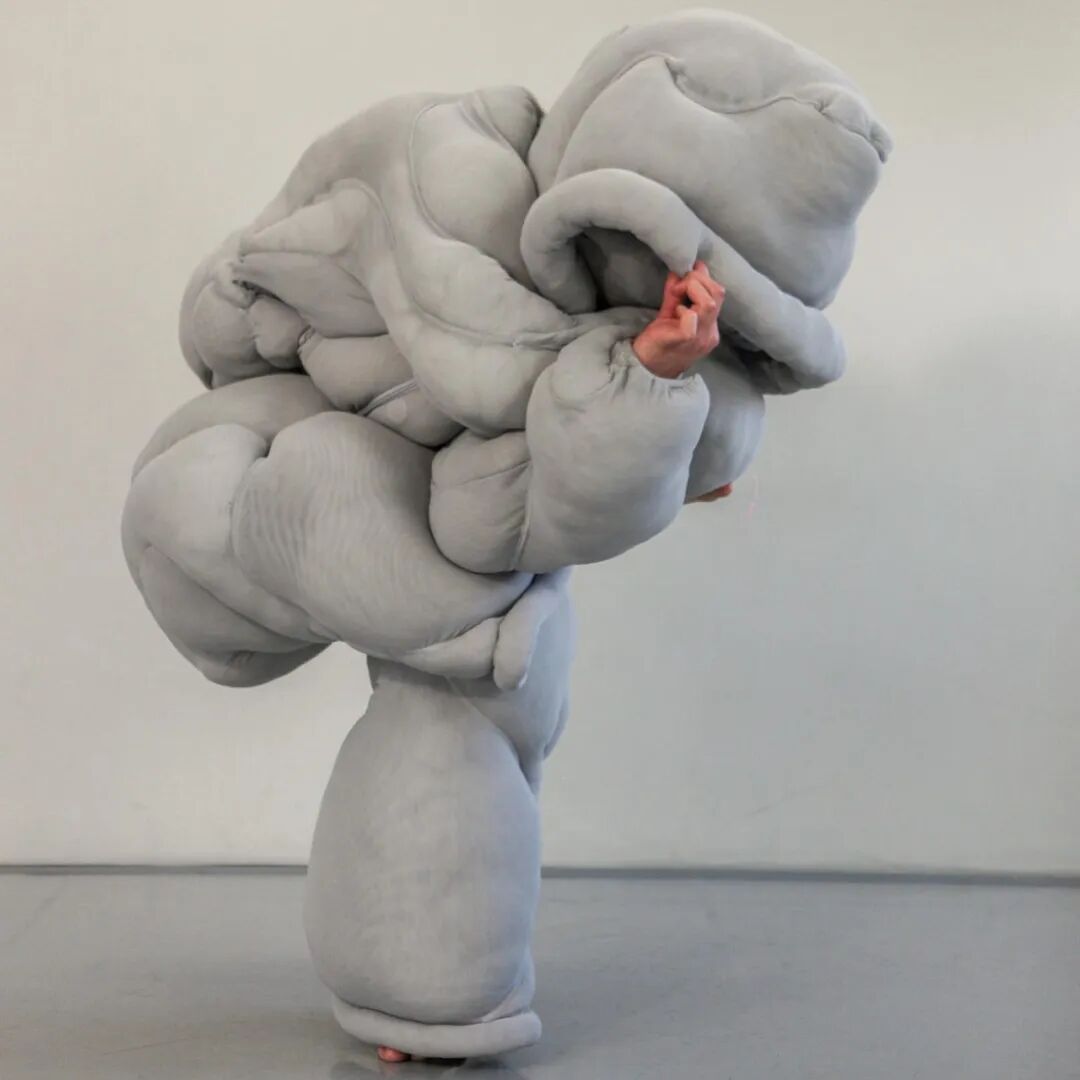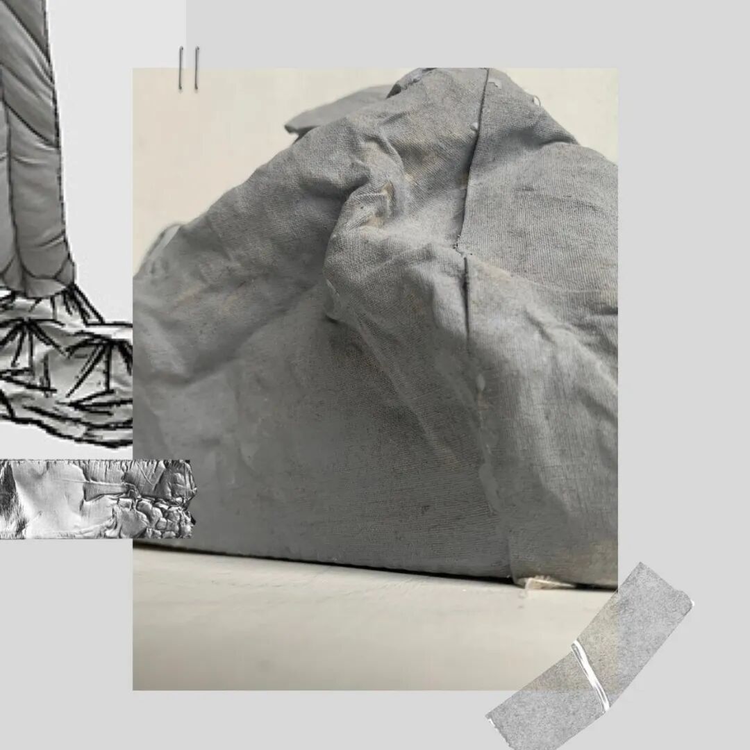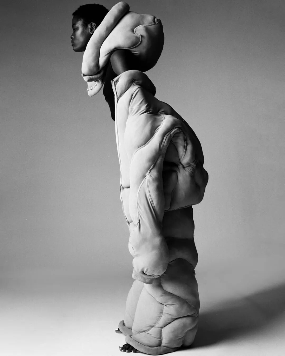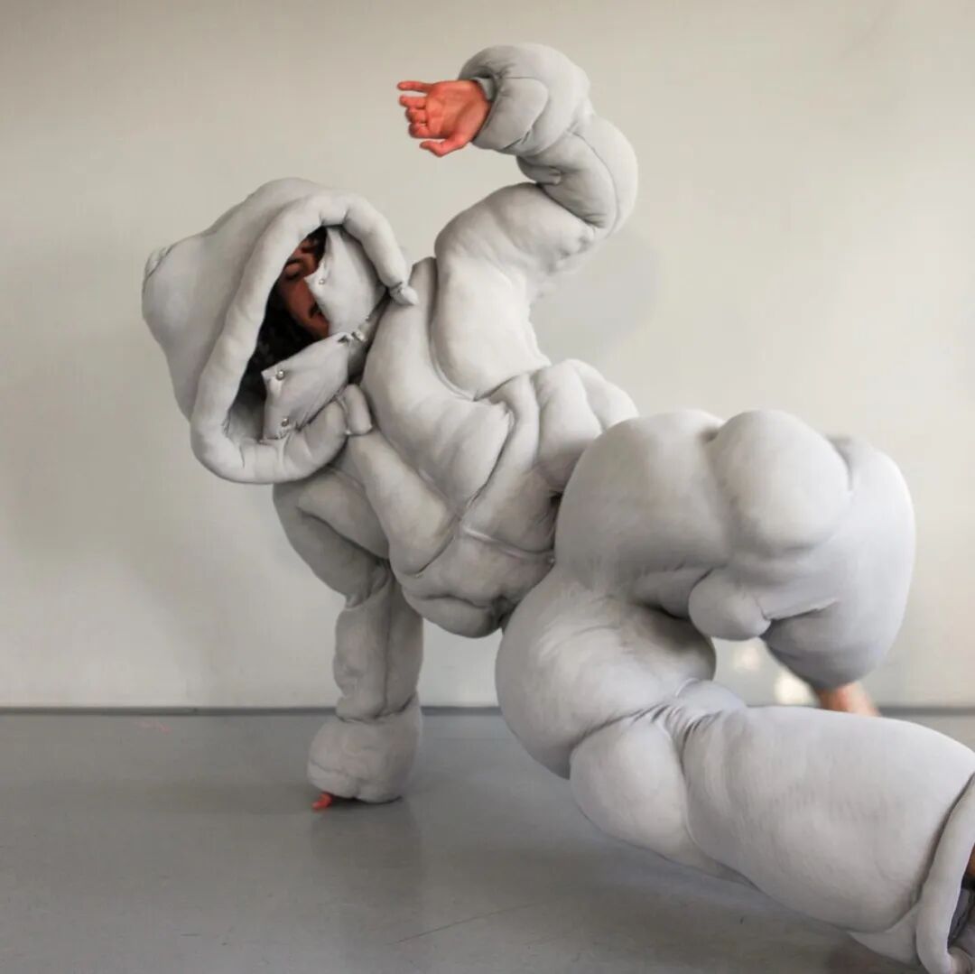 在其中的趣味体验的驱使下,他开始以人形为灵感,用橡皮泥制作手掌大小的人体模型,并用中国欧根纱和塑料网纱制作面料小样还原模型形状,最终在柔软触感的填充物与双向拉伸网的结合中获得了最理想的效果。