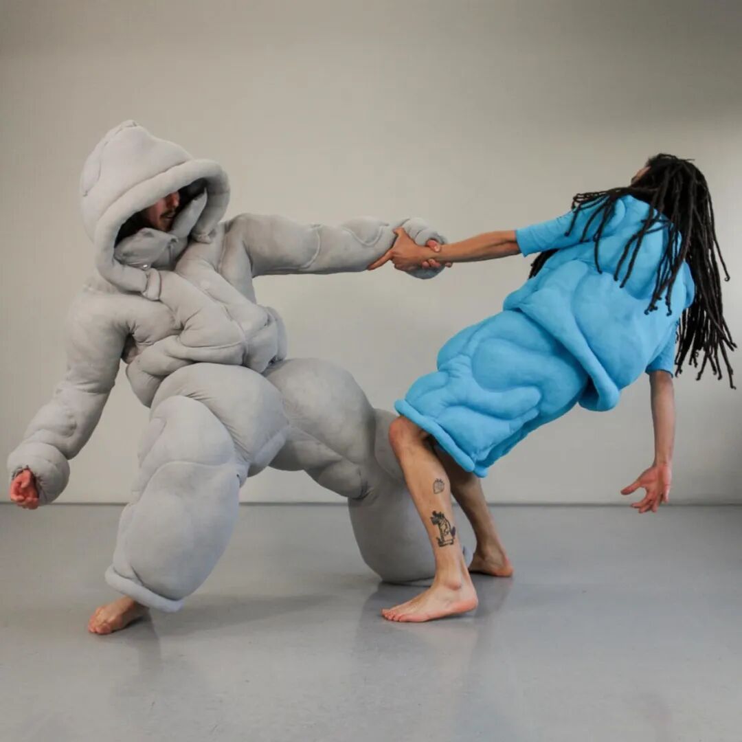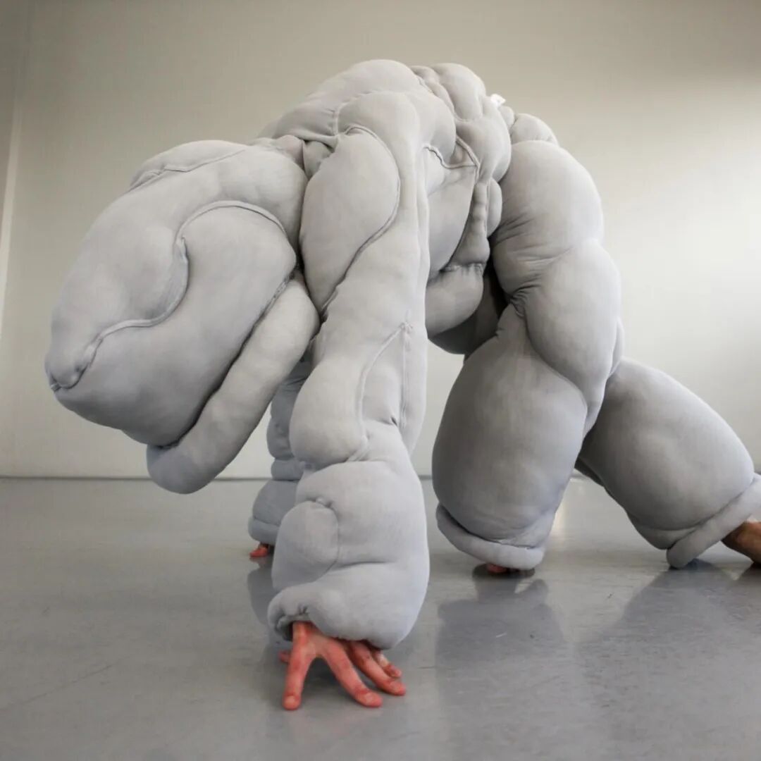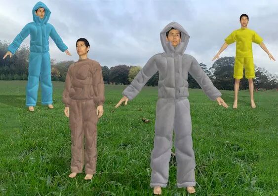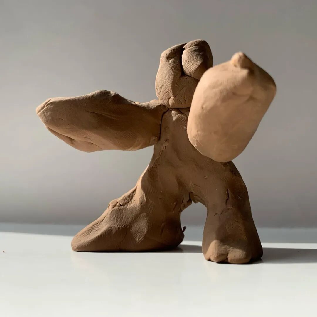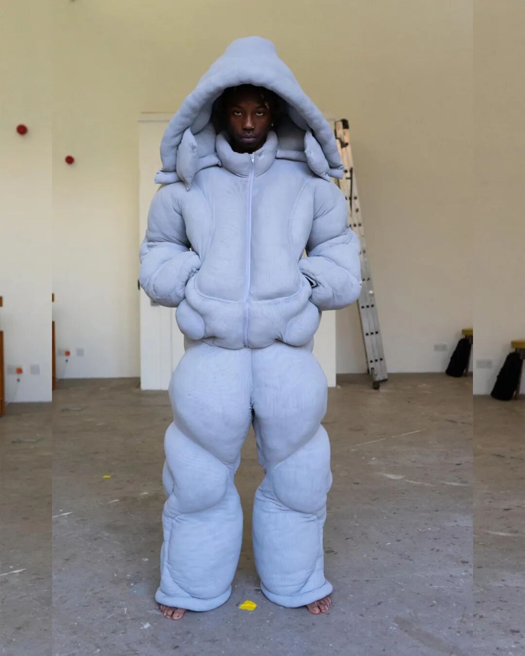 在其中的趣味体验的驱使下,他开始以人形为灵感,用橡皮泥制作手掌大小的人体模型,并用中国欧根纱和塑料网纱制作面料小样还原模型形状,最终在柔软触感的填充物与双向拉伸网的结合中获得了最理想的效果。