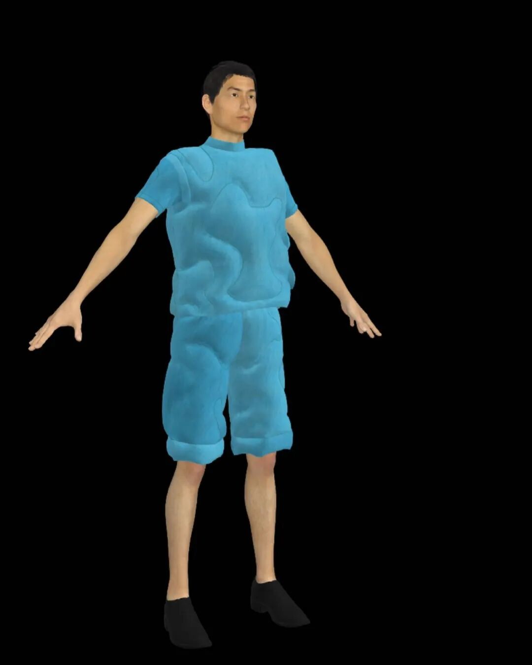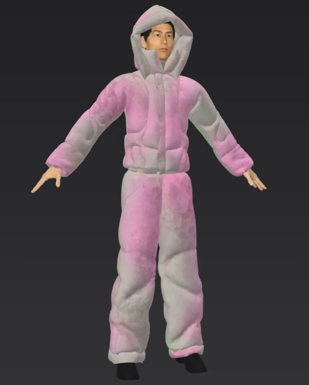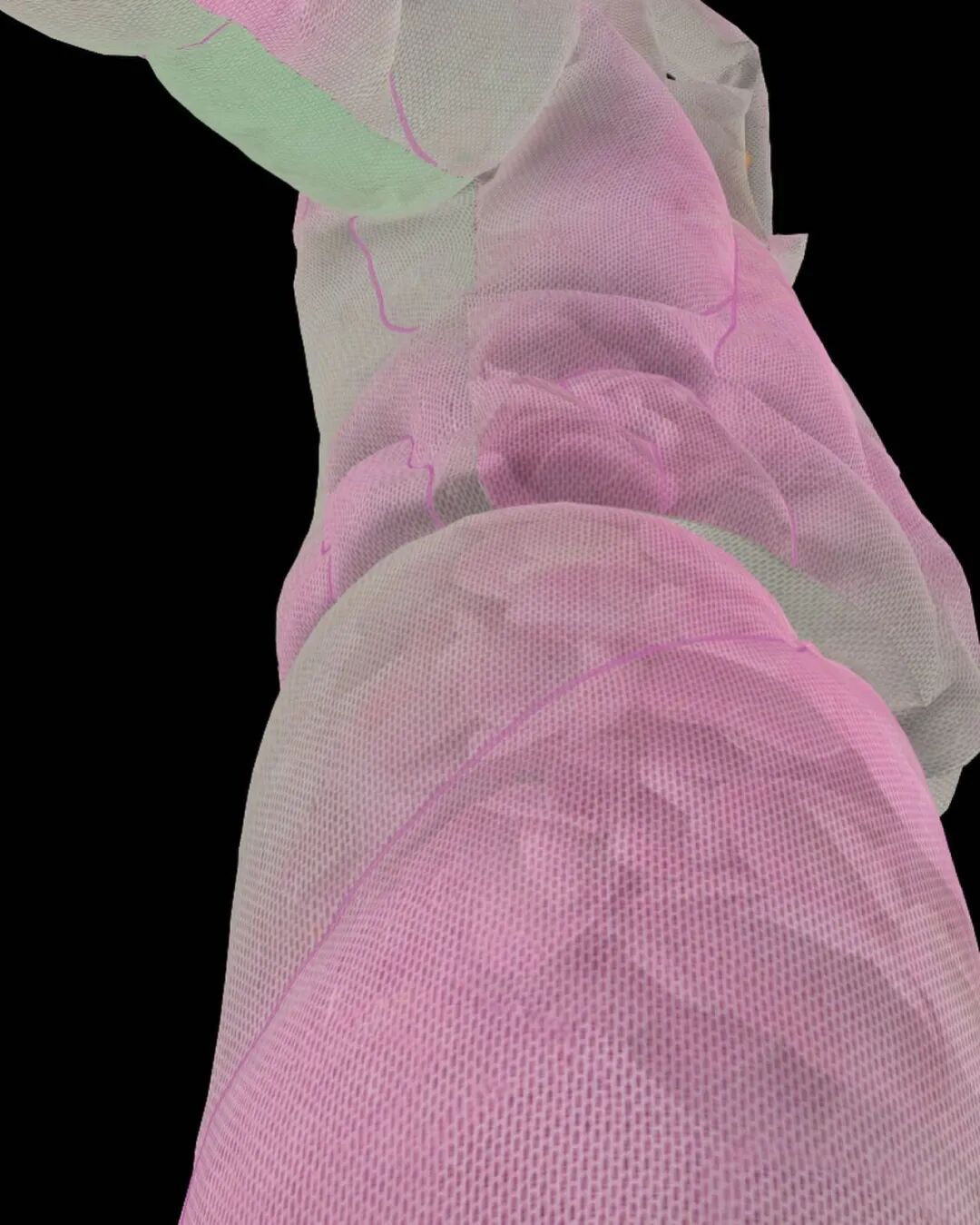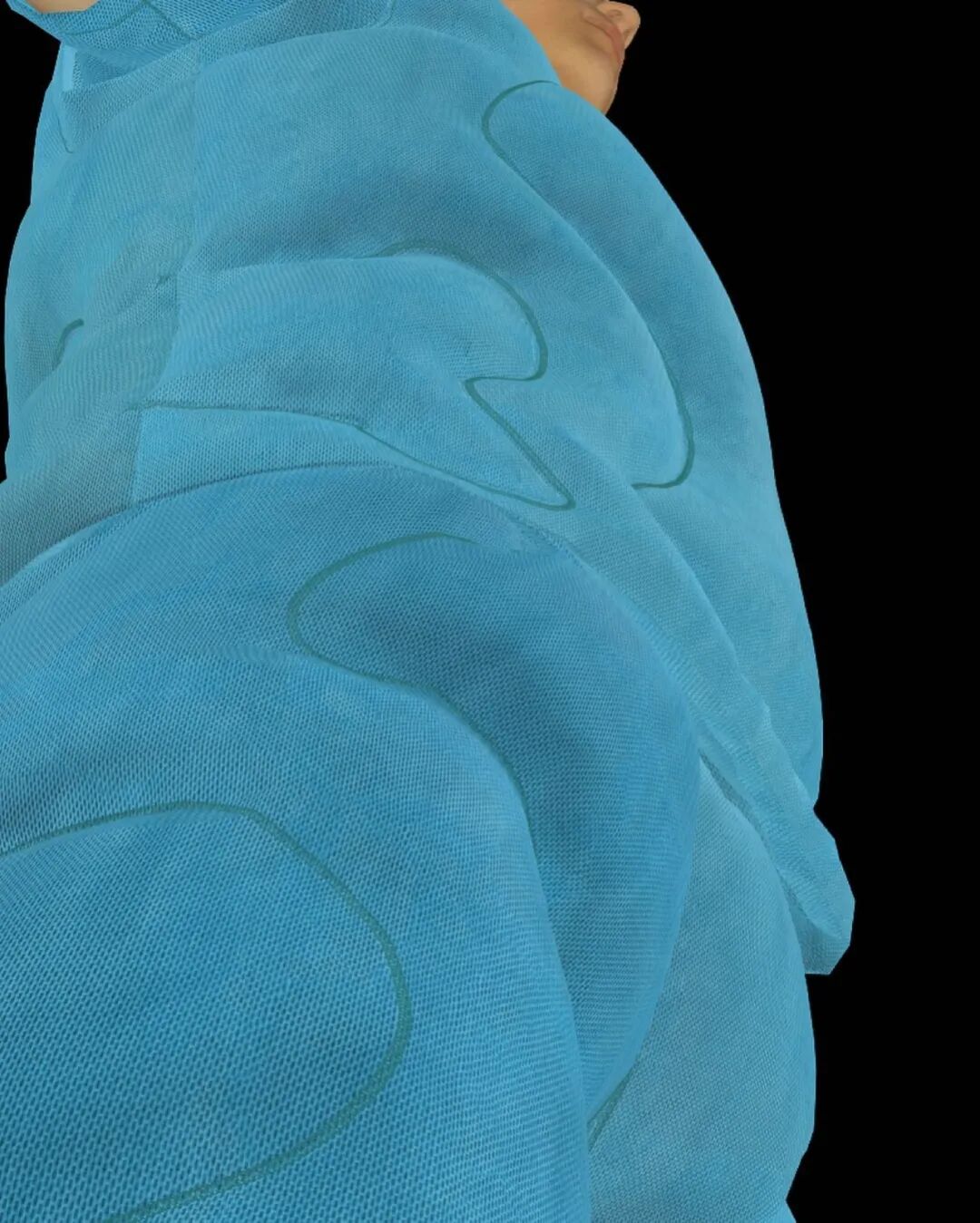 在其中的趣味体验的驱使下,他开始以人形为灵感,用橡皮泥制作手掌大小的人体模型,并用中国欧根纱和塑料网纱制作面料小样还原模型形状,最终在柔软触感的填充物与双向拉伸网的结合中获得了最理想的效果。