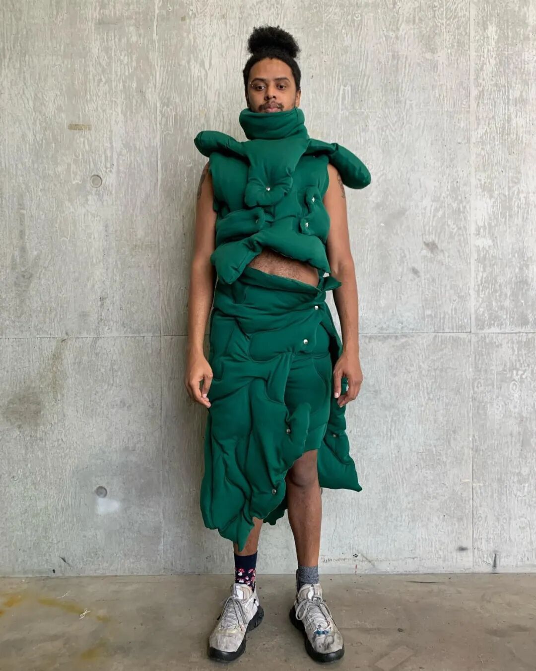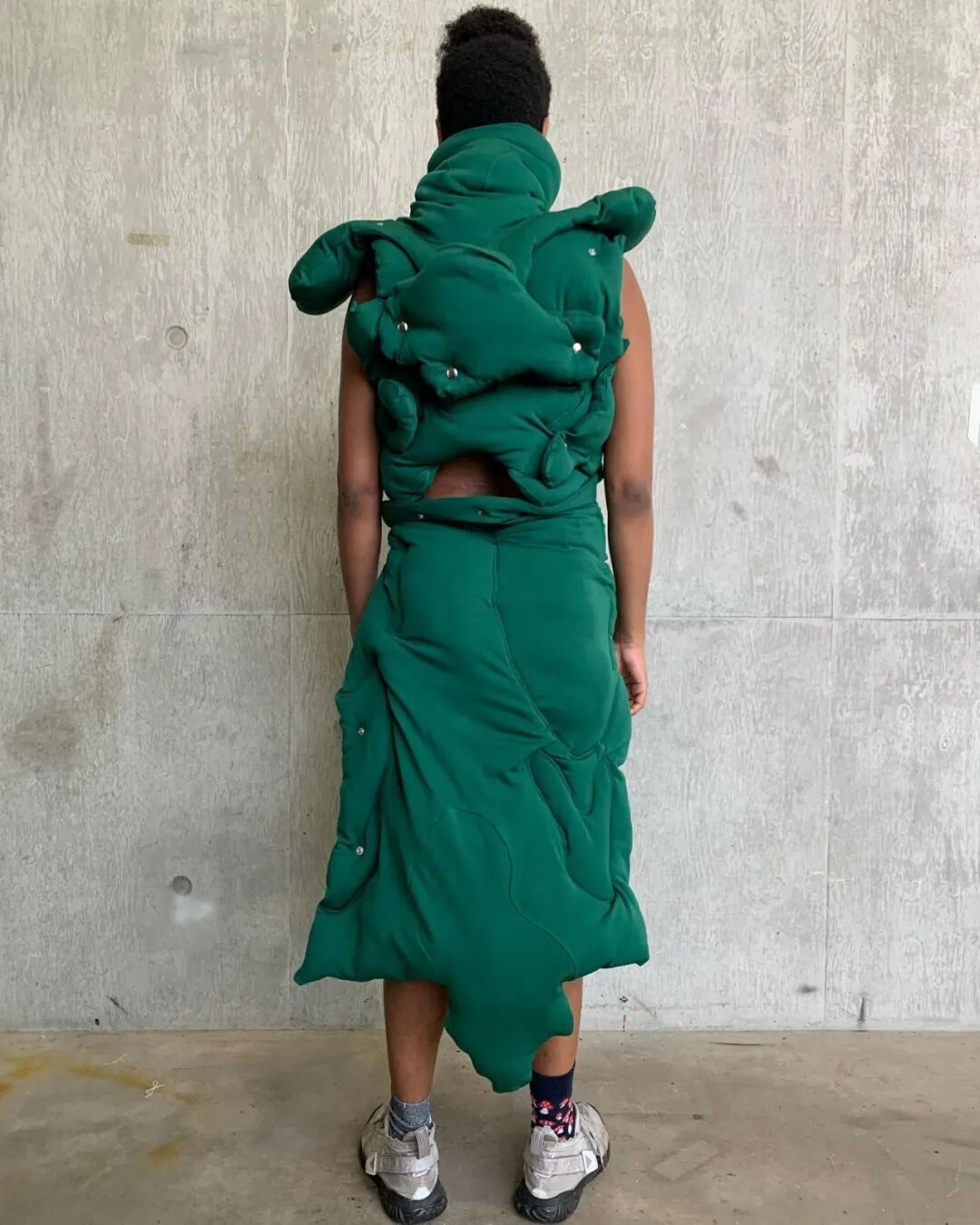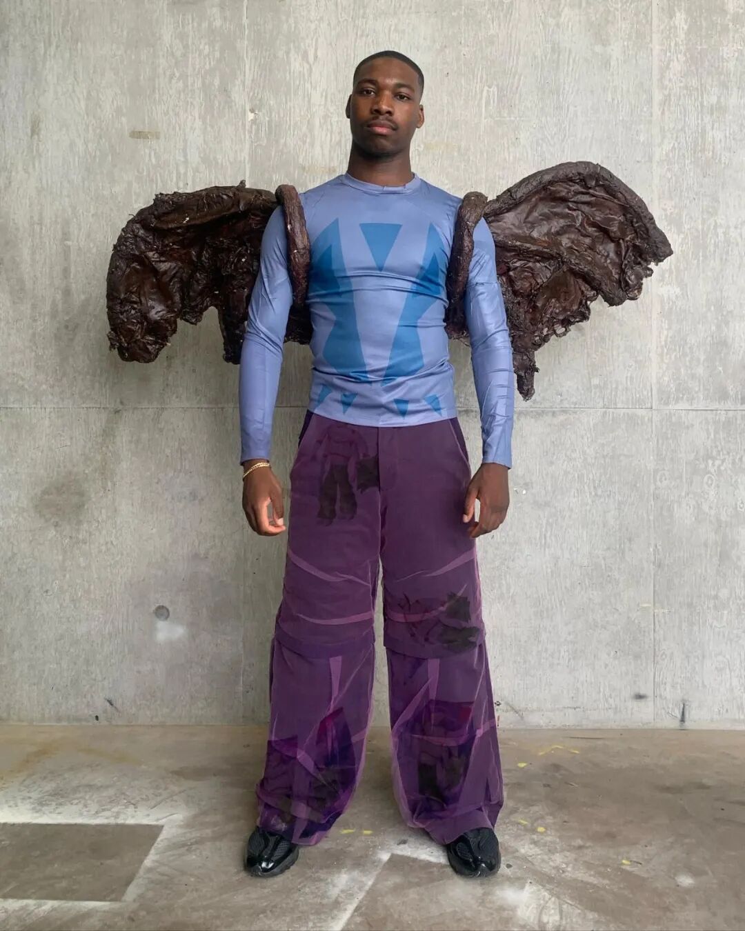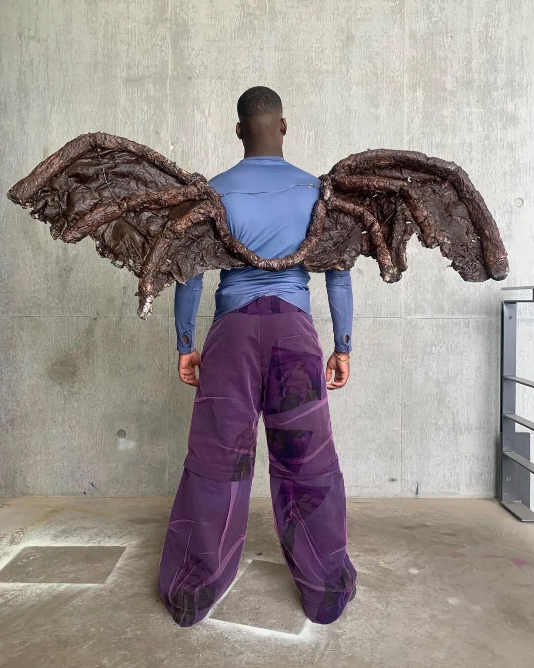 随后他将造型融入主题,用乳胶、废泡沫和金属丝制作了真人大小的龙翼,以及回收的菌丝体质地服装。