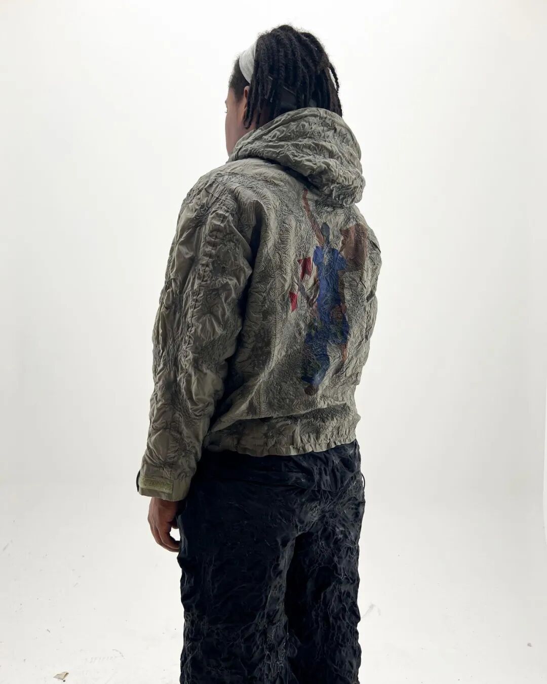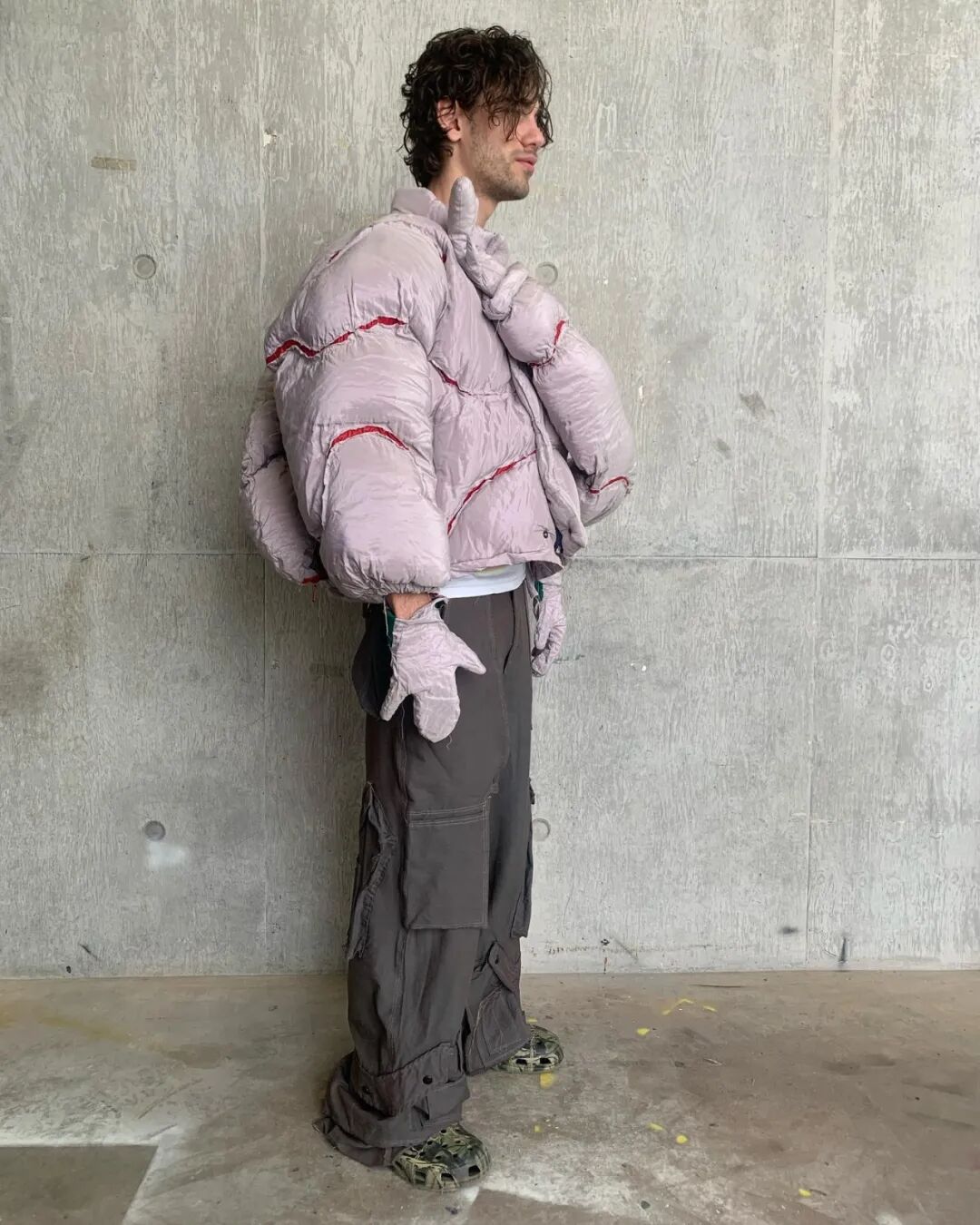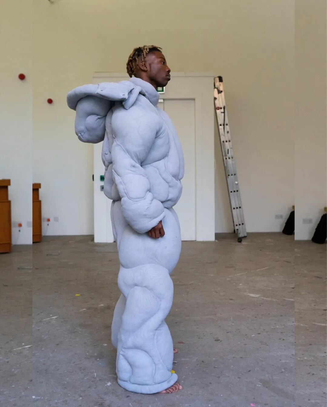 随后他将造型融入主题,用乳胶、废泡沫和金属丝制作了真人大小的龙翼,以及回收的菌丝体质地服装。
