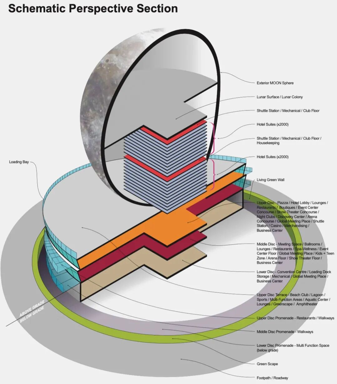 该度假村名为“月亮”,由一个围绕酒店的球形钢结构和建在三层圆形平台上的“月球”组成,上面包含了月球表面的景点。这座 224 米高的结构将被封闭在“世界最大的球体”内。在该球体内,一座 20 层高的酒店将拥有月球体验,这将模仿月球表面并包含一个“月球殖民地”。