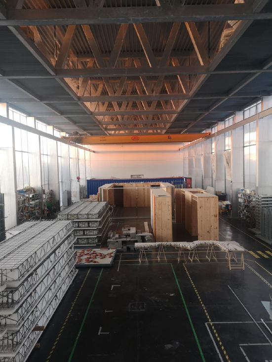 公司内部的生产间 摆满各种工作模型和1:1构件 桁架层被用作gallery屋顶还装了起重机