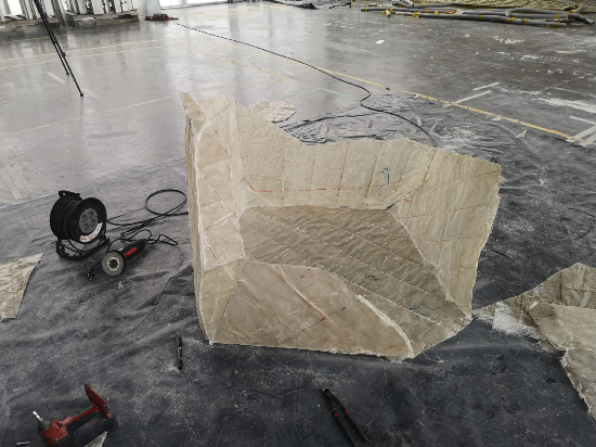 和老板接触的一次是最有意思的。当时他让我和另外一个实习生做一个概念模型推敲,需要用到一种回收的建筑材料板,是用玻璃纤维、树脂和钢筋网格组成的。他本人给我们展示如何处理那种板材,演示完他让我们注意安全,一定要戴手套,才给我们展示他的手上被划破了一道口子,鲜血渗出来,他直接嘬了一口,也没有去处理伤口,下一秒和另一个小老板俩人抱着一块石膏复合材料,啪的一下摔在地上,给我们展示碎片的随机性。我和另一位实习生直接呆在原地瞠目结舌,感叹他的工作激情和创造力。