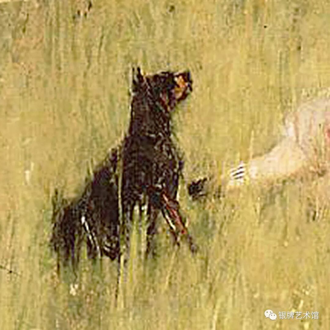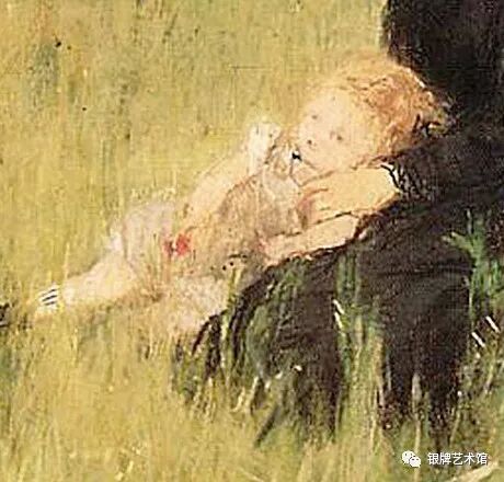 在这幅作品中青草和野花沐浴着和煦的光芒,观者仿佛可以感受到公园里的伴着花草香味的徐徐微风,以及持帽女孩甜蜜的笑容,一条可爱小黑狗望着身着黑衣的慈爱女子,她的怀里躺着可爱的婴儿。