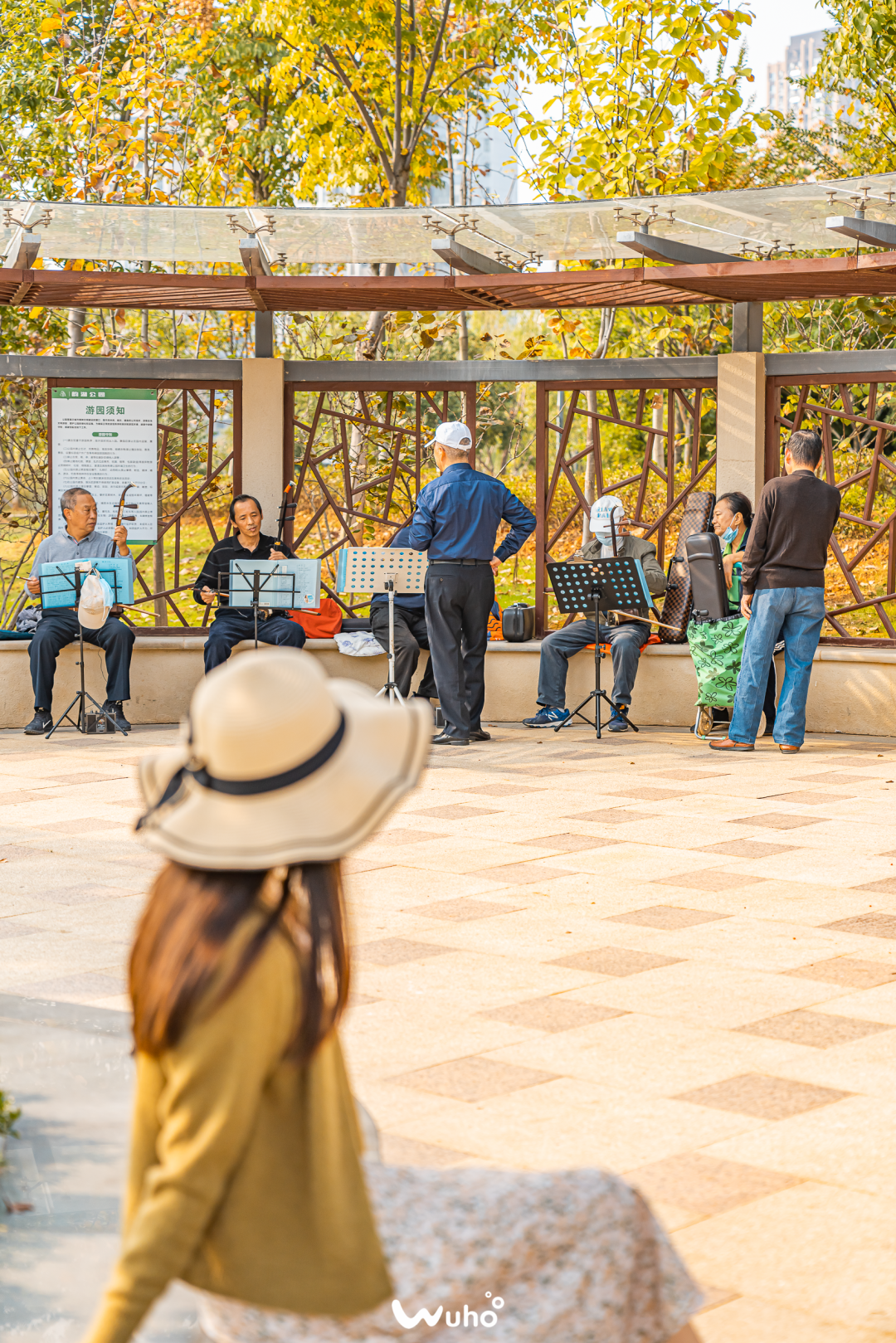 栾树投下阴影,8位老年乐手在浓郁桂香中演奏《红梅赞》。许爹爹用绿色买菜车拖来二胡,琴键手把家里的婴儿车带来当琴架,可爱。