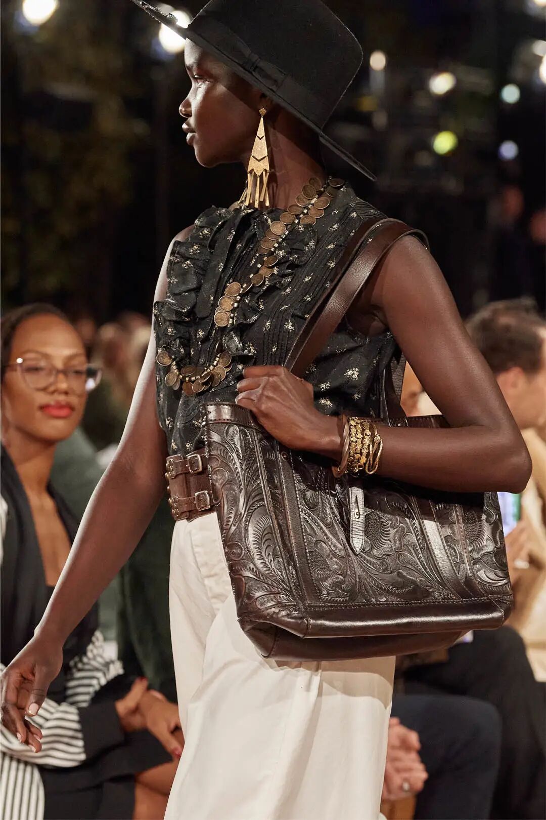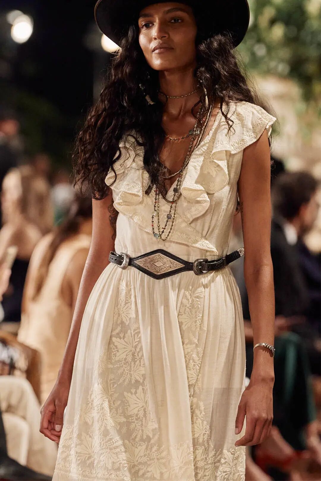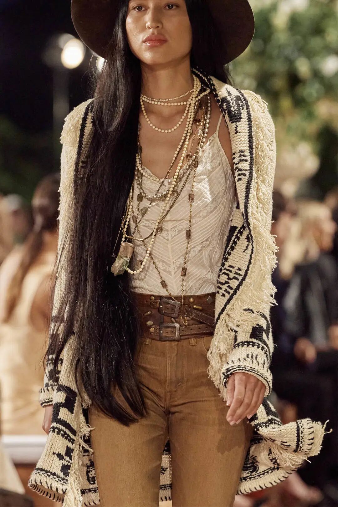 开场的身着低饱和度沙色西装,搭配复古宝石腰带和宽檐牛仔帽的优雅女士,再到紧随其后以美式复古水洗丹宁登场的男装,为这场加州梦注入了Double RL的粗犷与不羁。