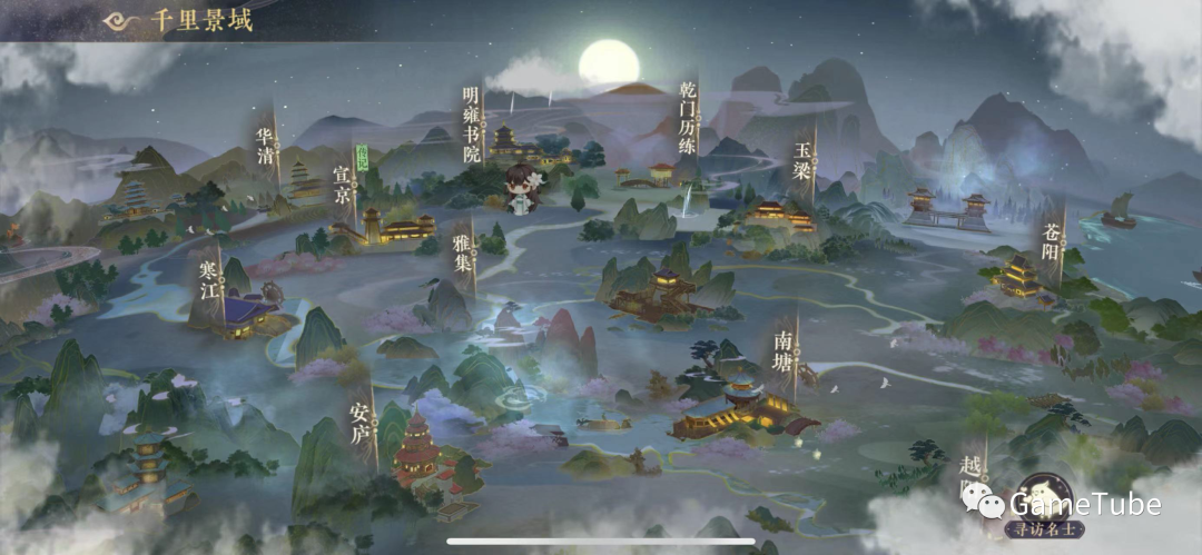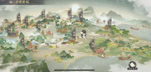 游戏的中“地图”界面,虽说是城镇式的布景,但功能跟地图一样,从画面风格上来看,依然走的是描金风格,构图中的远景和近景建筑,采用的都是风景画手法,再就是场景中的飞鸟、溪水、船舶、树丛都是动态的,赋予了整个画面一些生气。