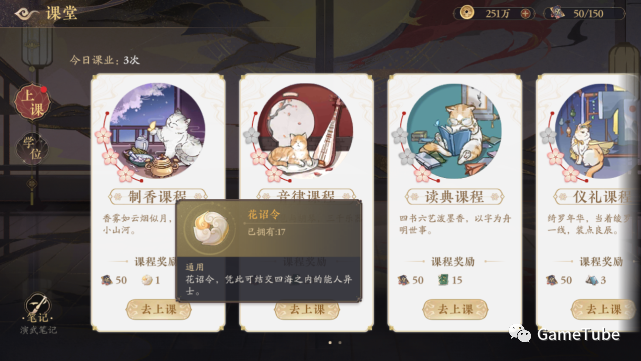 不过在上课环节中,根据所选课堂不同,会介绍游戏中的玩法和一些教程,很好的将新手教程与课堂融合在一起。但时间一长会出现严重偏科,比如课程奖励,初期会侧重有“花诏令”的课程,因为这个游戏也是“品质第一”路线,其中名士需要花诏令来抽取,说到这就明白为什么会偏科严重了吧。