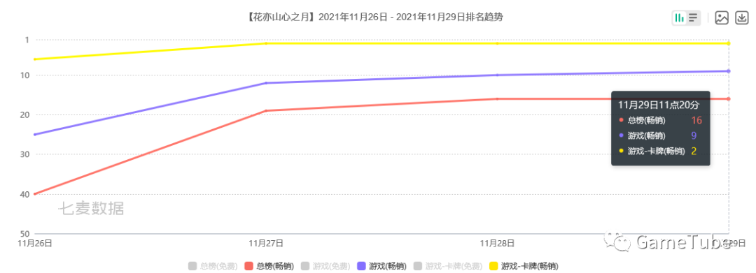 《花亦山心之月》上线三天畅销榜趋势(数据来源:七麦数据),游戏于11月26日上线,该款游戏当前在iOS系统位列免费游戏榜与卡牌榜第一位,取得了不错的成绩。原因有:1.引人入胜的剧情 2.皇家学院的体验感 3. 精美的国风画风。