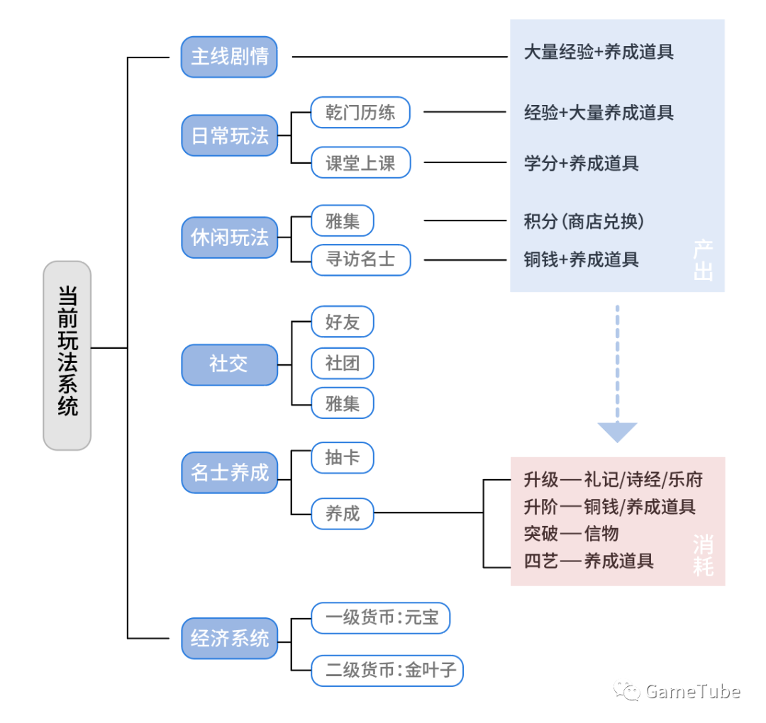 目前《花亦山》的基本玩法主要包括主线剧情,乾门历练,课堂上课,雅集,寻访名士及社交和卡牌养成。乾门历练与课堂上课作为卡牌养成消耗的主要产出方式。雅集与社团则成为了玩家间社交的主要桥梁。