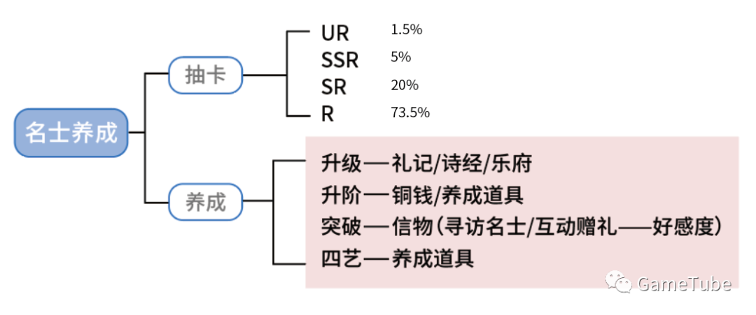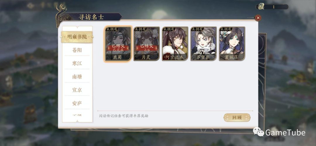 剧情向,通过寻访名士,解锁各个名士背后的传记故事,同时产出名士信物,用于培养名士好感度。