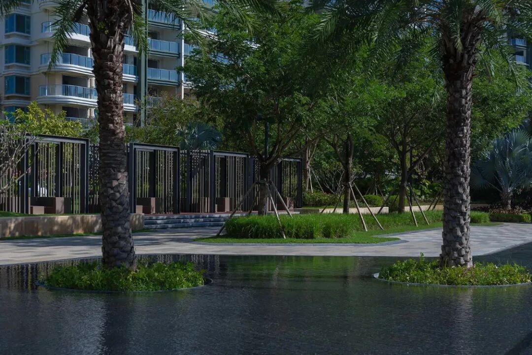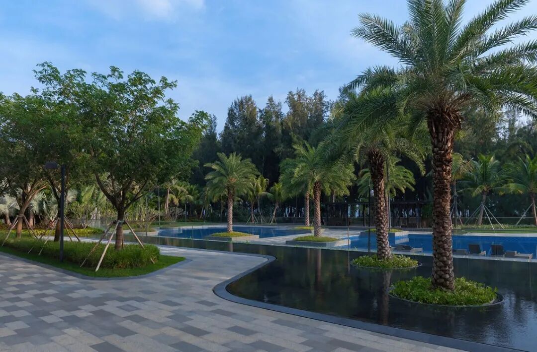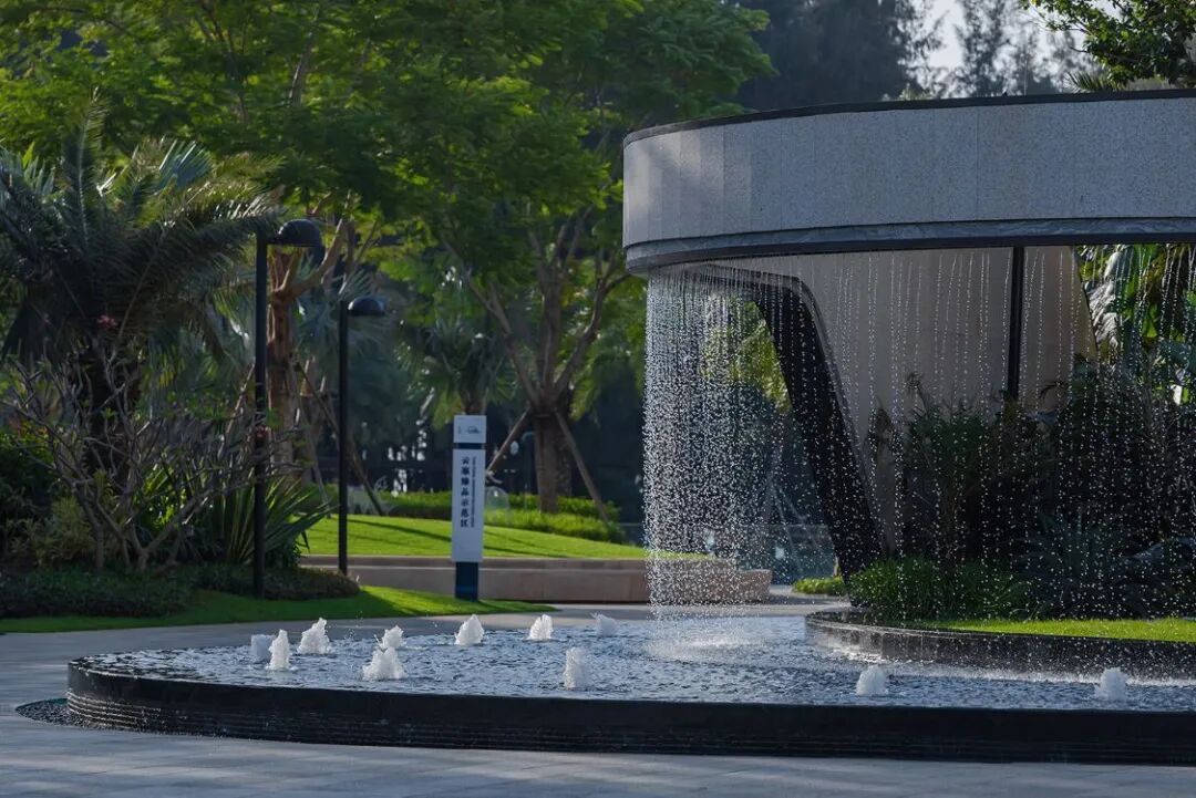 穿过椰林夹道,黑色光面花岗岩基底的镜面水景闪耀着粼粼波光,水中树影轻摇,小小的涌泉为空间增加了灵动之感。