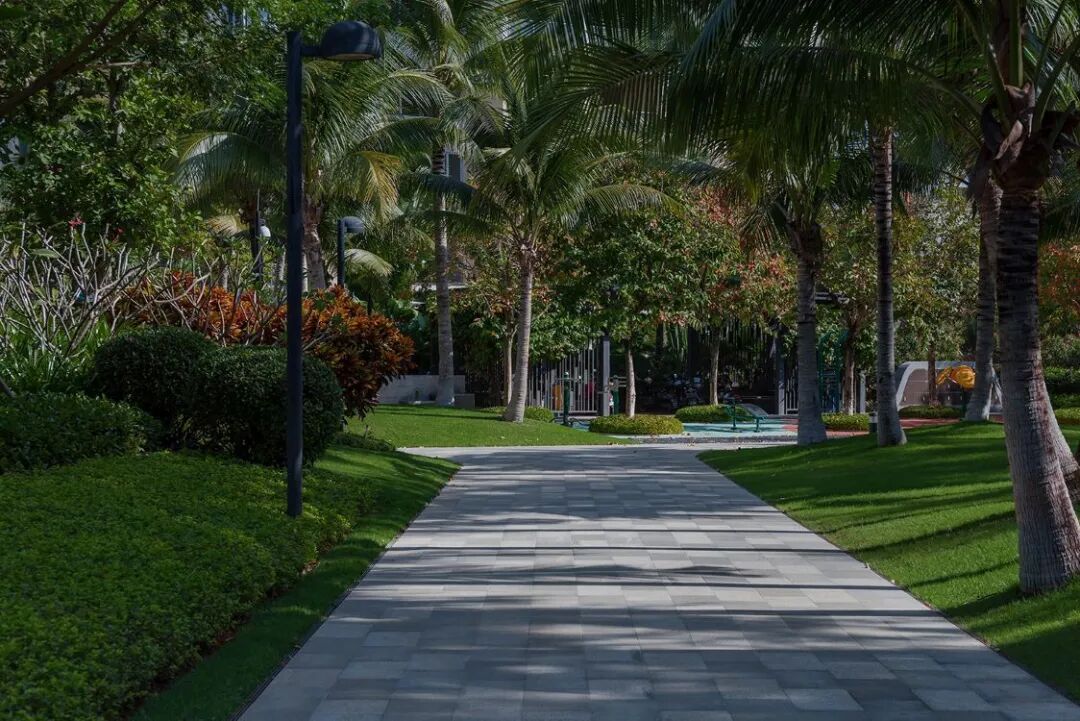 设计中通过去风格化的手法,以简洁的设计,适当的留白,营造假日风公园式人居社区,网络状的园路串联各景观空间,让漫步愈发随性。悬挑的昭示性景墙、椰林夹道、阳光草坪、镜面水景、休闲廊架、风情泳池,演绎丰富的空间节奏,游走于流动地无定形的多样空间中,享受生活的惬意。