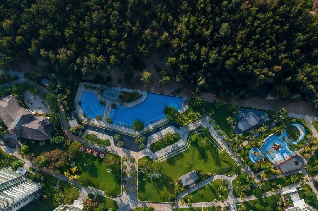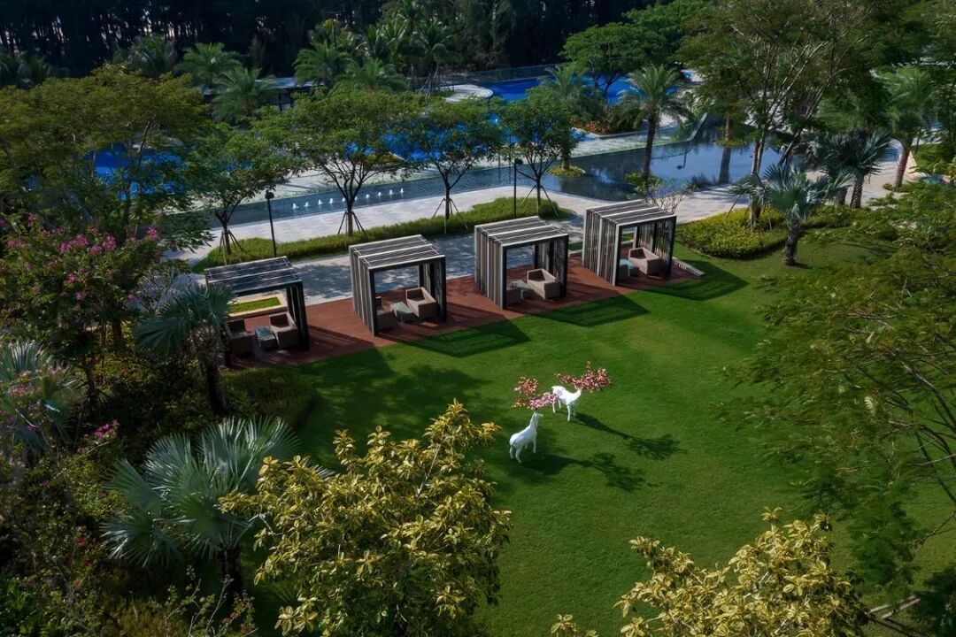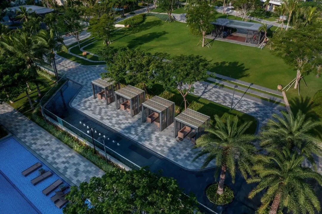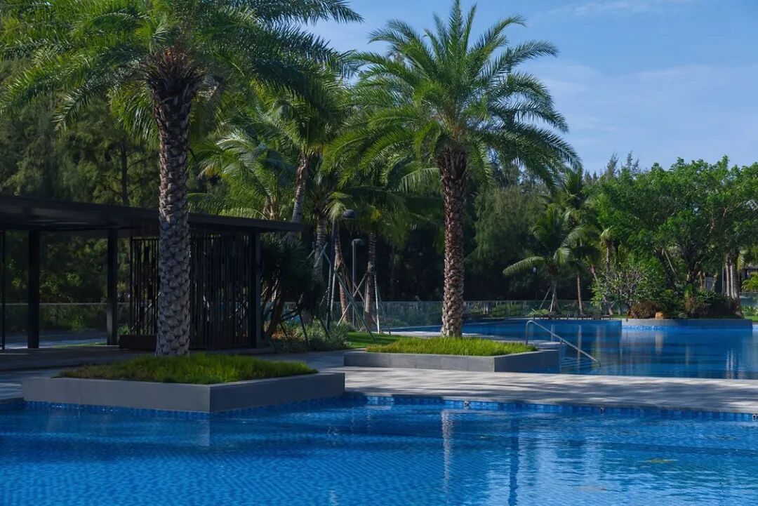以蓝色马赛克为底的开放泳池,划分出小孩与成人的不同空间。以无边界的姿态,消融了小区与海景的界限。鸡蛋花、椰子树高低错落,让空间层次多变,又通透敞开远眺大海。