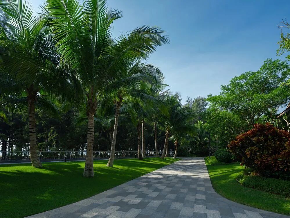 以大片的椰林草地作为第一印象,极致纯粹,轻松自然。视线在树影中穿透,隐约窥见点点星光。让自然引领回家的心情,让内心追寻大海的风光,展现轻奢浪漫的度假风情。