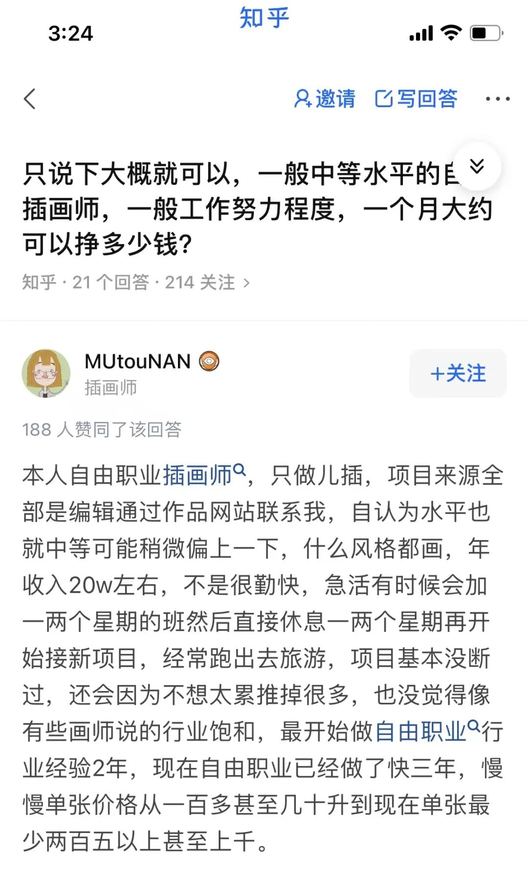 知乎上也有关于自由画师收入薪资的问答,中等水平,年收入20万左右