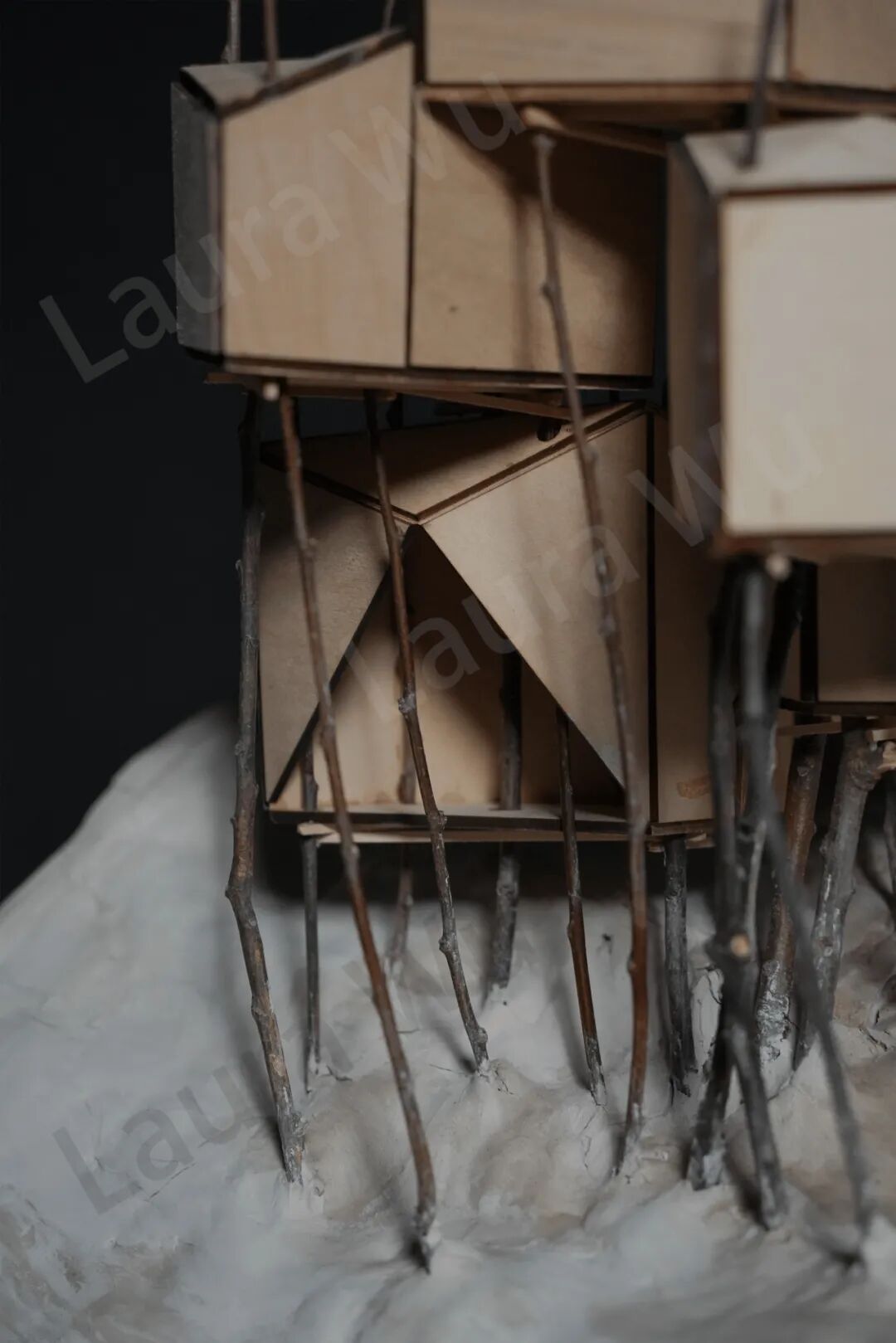 由木板制成的体块轻盈而坚固,能够有效固定每颗树木的位置。每个体块下方的木条支撑结构将树干从内部链接,从而平衡从四周涌向树干的流体的冲击力。体块的体积由体块的位置高度决定,以此避免给树干造成过大的负担。由于树干靠近根部的位置一般更加粗壮坚固,承重力较强,我将体积更大,也就是更沉重的体块都放置在了靠近地面的位置。高度越高,体块的体积越小。体块的开口都面向泥石流起始点(坡顶),便于使用者观察流体运动情况