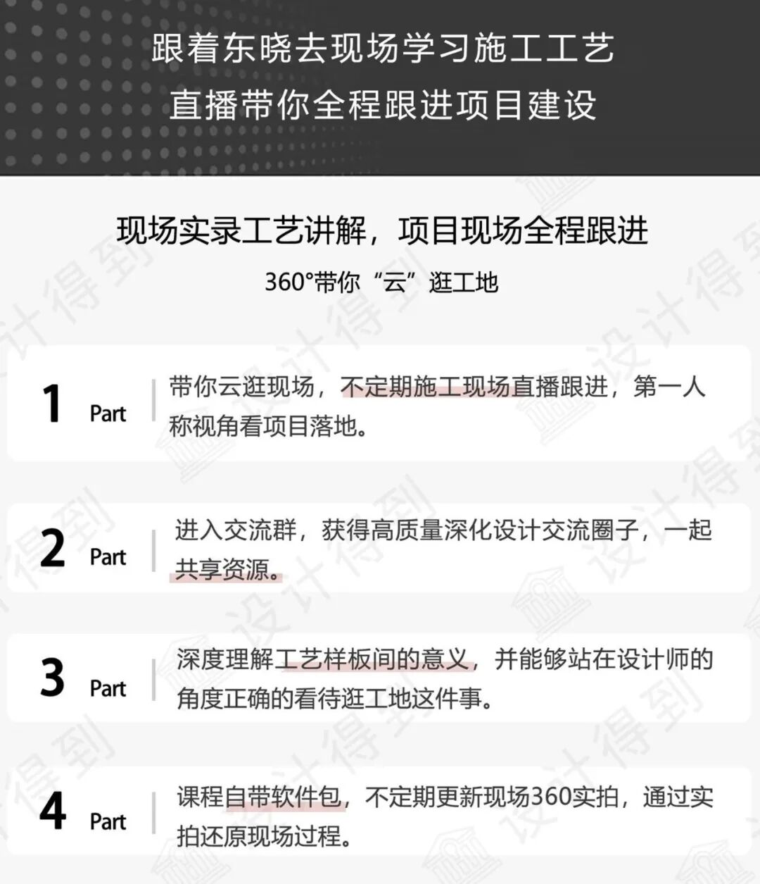 最后,以上内容都包含在《跟着东晓逛工地》中,课程360°全景解读工艺样板间下的秘密,推荐给正在学习“工艺节点落地知识”的小伙伴们。