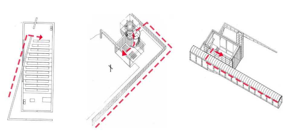 光之教堂从建筑的侧面进入,转了一个90度进入教堂,水之教堂从入口的进入方向到最后进入教堂的后部,方向也转了一个90度。风之教堂从长廊进入,最后也转了180度从后面进入教堂,这三个教堂流线都转了一定的度数进入教堂。