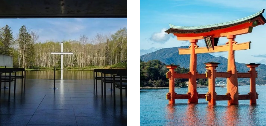 神道教是日本的本土宗教,也是日本的国教,神道教中的有的神社就是将象征神域的鸟居放在水上,例如严岛神社太鸟居,而这应该就是水之教堂的雏形。