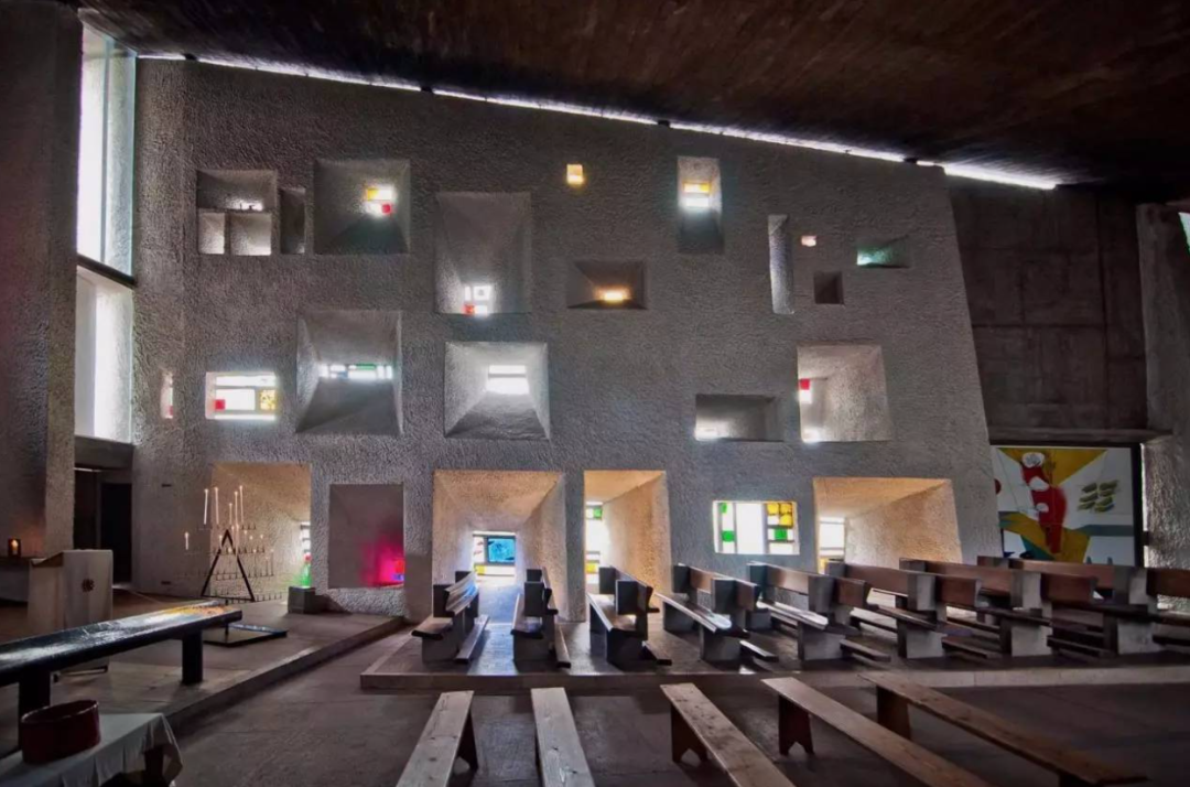 朗香教堂因为对光的表达而闻名于世,光线从大大小小的孔洞以及不同的方向射进昏暗的室内,给人一种神圣的感觉。