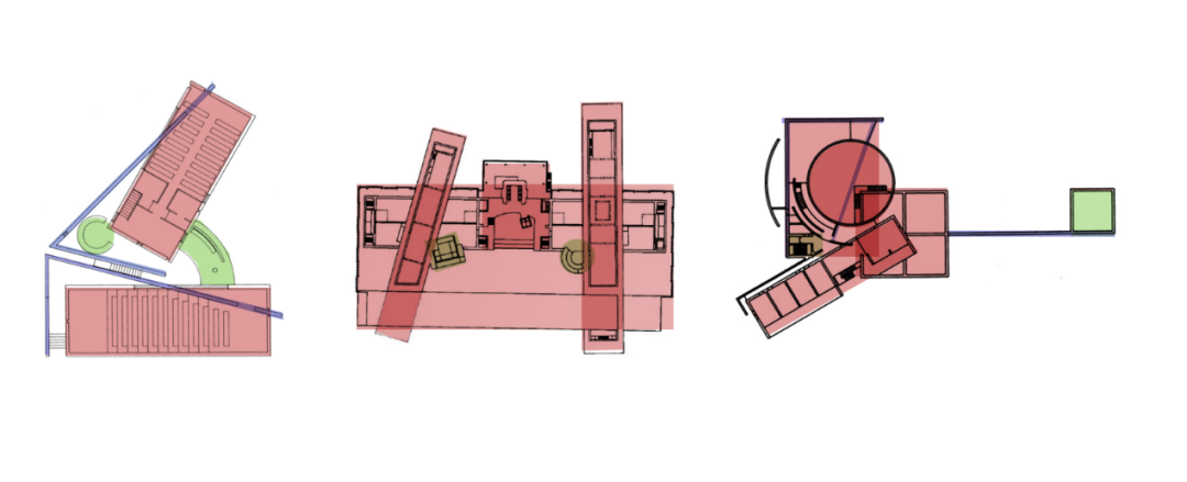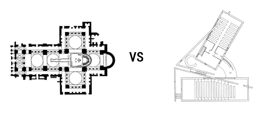 这种差异首先可以体现在平面上,事实上,传统的教堂的尤其对称、严谨的平面布局与现代设计语言的复杂、不对称、矛盾统一的语法相冲突。
