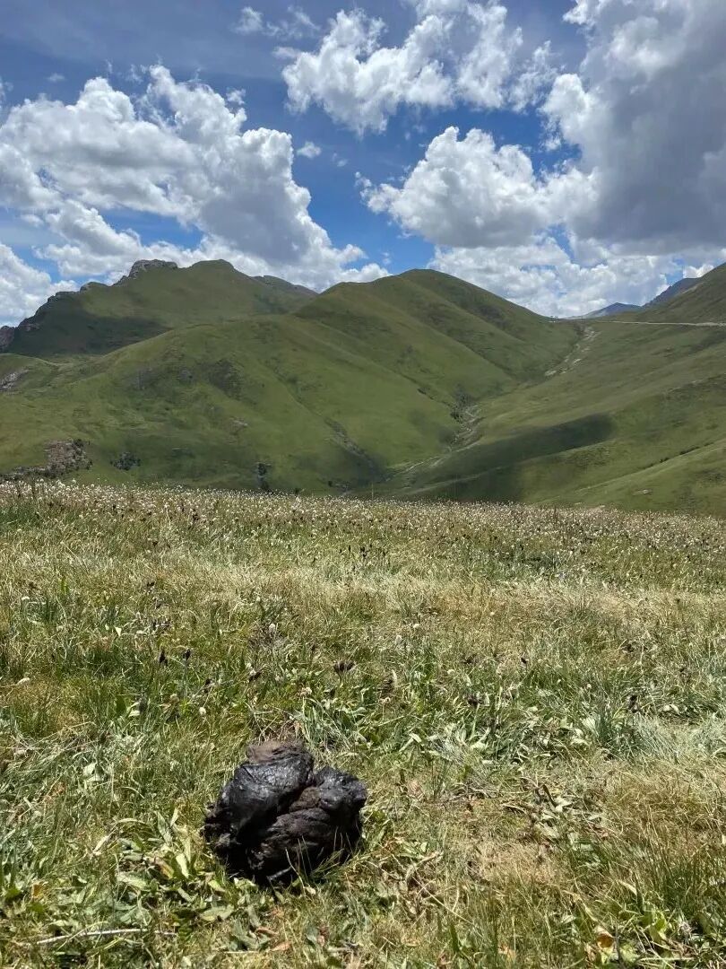 熊是最可怕的动物,玉树地区近几年来,一直有熊伤人的案例发生。我们在徒步两座山的时候,1次途径了空的熊窝,地上有秃鹫残留的巨大的羽毛,藏族向导吹着口哨带我们快速离开。在另一座山上,我们也看到了熊的新鲜脚印,向导判断是前一天晚上有来过。