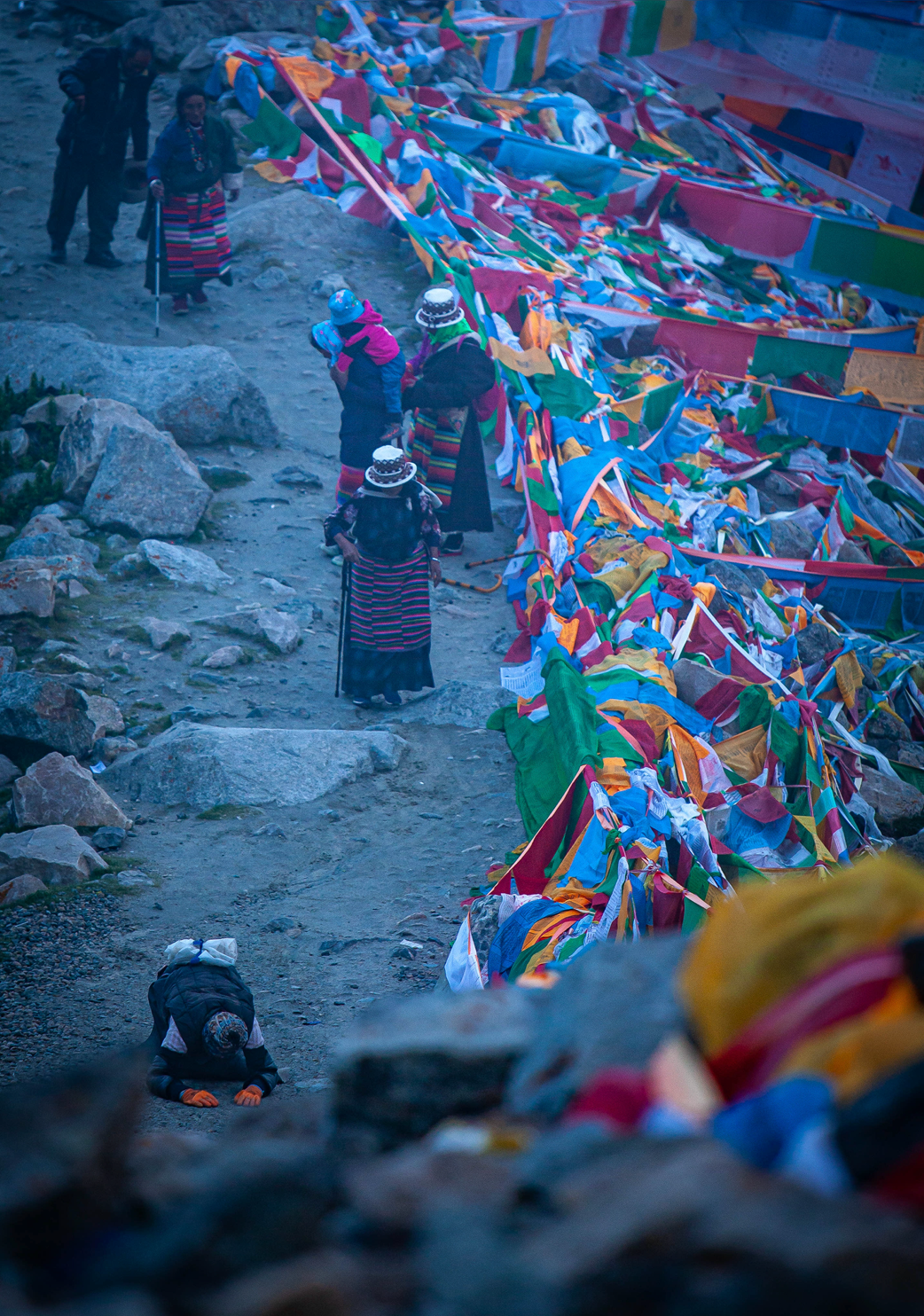 感受到“信仰的力量”是在玉树市区去杂多的往返路上,我亲眼看到了长距离的朝圣个体,长距离基本是近2000公里的朝圣路,要花费6到9个月的时间去完成,终点在拉萨或者是西藏的神山。途中会遇到各种艰难险阻:自身的精神意志挑战、身体状态的挑战、公路上的车辆风险、恶劣的天气、野生环境露营遇到猛禽等等。