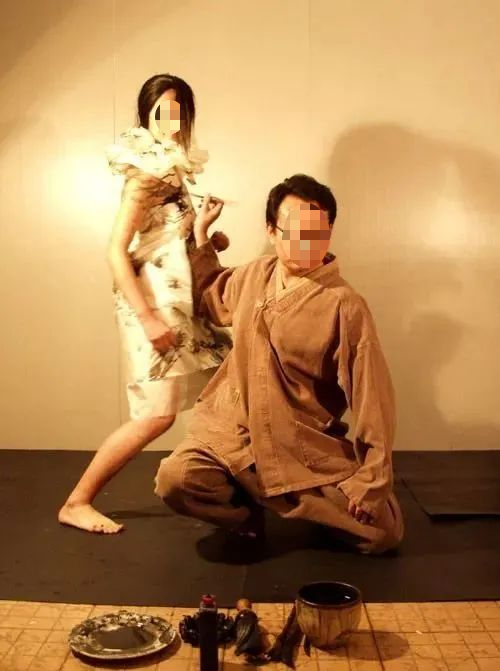 这位闭眼玩书法的人才是四川美院的教授张X,张X脑袋还是好使,懂得借势造势,人家会把字写到美女身上。