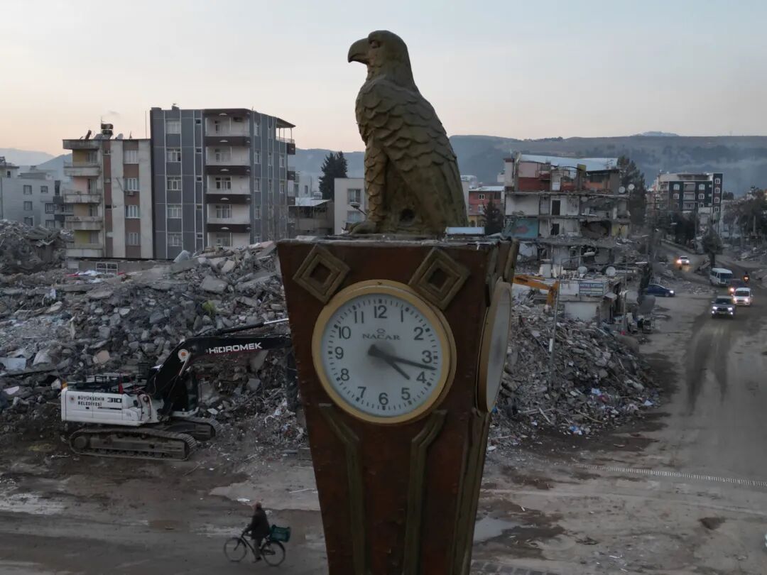 一只老鹰(奥斯曼帝国的吉祥物)歇息在钟楼顶望向远方。钟楼上的时钟已毁坏,指针永远停在了2月6日凌晨04:17地震发生这个时刻。