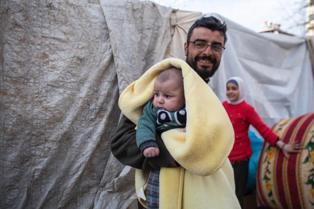 这是一位来自叙利亚的难民,他抱着2个月的女儿,他已经有4个孩子了。在叙利亚时他是个律师,8年前他来到了土耳其当难民。他租的房子震塌了,战争与地震造成了他们的双重流离。