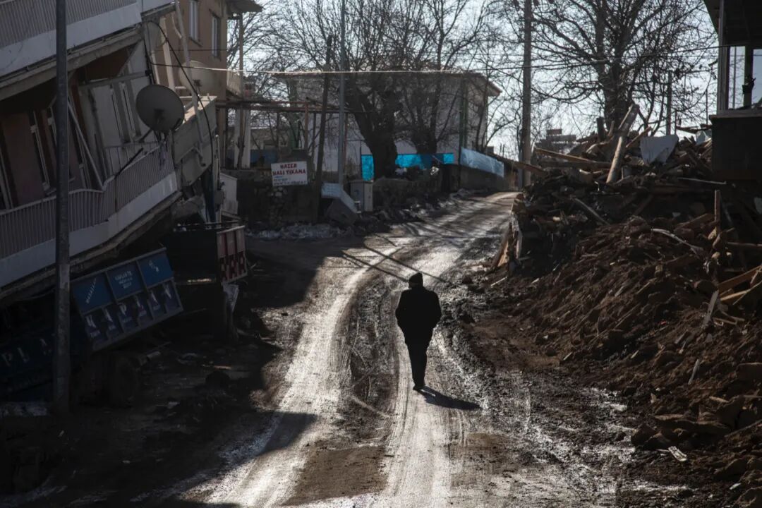 逆光下一个孤独的身影。路的两旁都是完全被震塌了的房屋。